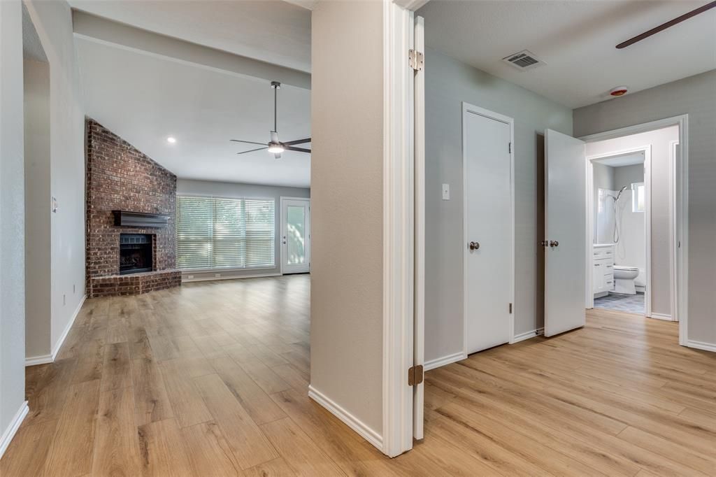 FULLY REMODELED Beautiful Home on a private street with a Cul-De-Sac! The living room welcomes you with a vaulted ceiling, a wood-burning brick fireplace with classic wood mantel, and abundant natural light. The chef’s kitchen features brand-new white shaker cabinets with custom touches such as a lazy Susan, base tray cabinet, and pot-and-pan drawers. Quartz countertops and grey-and-white subway tile backsplash pair beautifully with brushed nickel hardware, a pull-out sprayer faucet, and stainless-steel appliances including a built-in microwave, electric glass cooktop and oven, 3-tray steel tub dishwasher and 12x24 porcelain tile floors. The dining area offers a decorative chandelier and window seat, while the master suite provides a relaxing retreat with a pan ceiling, ceiling fan, and a shaker-style vanity with quartz countertops, rectangle sink, walk-in closet with built-ins and brushed nickel faucets. Secondary bedrooms include walk-in closets and ceiling fans, with an updated guest bath showcasing porcelain tile flooring, a shaker vanity, and Quartz countertops. Outdoors, enjoy an 8-foot board-on-board wood fence with kicker boards, a concrete rear patio perfect for gatherings, ample rear parking for up to 4 vehicles, and the natural beauty of mature trees. A 2-car garage, smooth Chamberlain garage door opener, and recently updated HVAC and hot water heater provide peace of mind. Recent upgrades include LED lighting, Edison-style fixtures, 2-inch wood faux blinds, energy-efficient vinyl windows, 7 inch luxury vinyl plank flooring, fresh interior and exterior paint. Craftsman-style front door, updated rear door, brushed nickel hardware, hinges, and an upgraded mailbox add charm and curb appeal. Roof and fence are under 10 years old!