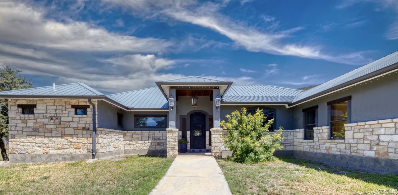 Nestled at the base of a hill in the picturesque Concan, Texas Hill Country, this stunning 5-bedroom, 4.5-bath ranch-style home offers luxurious living on nearly 6 acres. The open-concept layout features a modern kitchen with stainless steel appliances, a wet bar, and expansive living areas, perfect for entertaining. Step outside to enjoy the spacious outdoor living area with a bar, lounging area, and pool-ideal for soaking in the scenic Texas sunsets. Additional amenities include a 2-car garage, parking garage, and multiple storage buildings. This serene retreat is the perfect blend of rustic charm and modern convenience, offering privacy and tranquility close to the crystal clear Frio River.