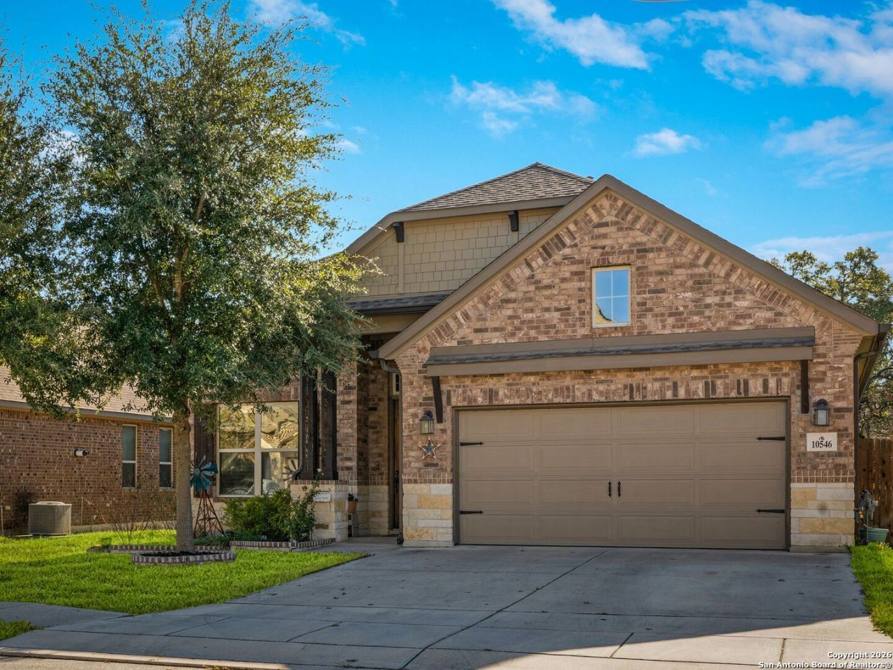 Welcome to refined Hill Country living in this beautifully appointed modern Craftsman home with Hill Country influence, tucked inside an exclusive gated community in Helotes. Offering 3 bedrooms, 2 baths, and an oversized 2-car garage, this 2,185 sq. ft. residence blends thoughtful design with timeless craftsmanship. A Knotty Alder rustic front door with a speakeasy window sets the tone as you enter into a light-filled, open-concept floor plan. Rich wood-look tile flooring, two-panel arch top shaker doors, and high ceilings elevate the homes warm, sophisticated style. The gourmet kitchen features a gas range, oversized granite island, glass tile backsplash, and staggered upper cabinets, perfect for everyday living and effortless entertaining. A separate dining room provides additional hosting space. The spacious primary suite offers a serene retreat with his-and-hers walk-in closets, a garden tub, and a separate shower. Secondary bedrooms are well-sized for family, guests, or a dedicated office. Step outside to your private oasis, an Entertainment Pool by Gary Pools with tanning ledge, Kool Koating decking, and extended Trex patio decking. Outdoor plantation shutters provide shade and style, while the homes position on a greenbelt with wrought iron rear fencing enhances the surrounding natural beauty. A privacy fence lines both sides of the yard. Additional features include a water softener, extra overhead storage racks in the garage, and the peace of mind of a private, gated neighborhood. An exceptional added benefit: This home offers an assumable VA loan at a very low rate, a rare and valuable opportunity for qualified buyers.