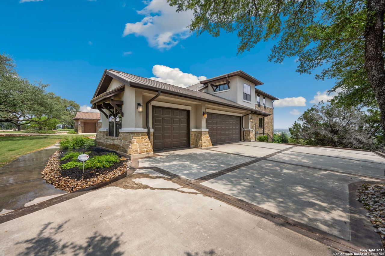 Welcome to 1078 Star Ridge, an exceptional custom-built home located in the highly desirable Mystic Shores community of Spring Branch, TX. Perched on 1.76 acres with mature oak trees and panoramic views of Canyon Lake and the Texas Hill Country. This stunning property offers luxury, privacy, and tranquility in one of the areas most prestigious neighborhoods. The 4,297 sq ft residence features 3 bedrooms, 3.5 bathrooms, a dedicated media/game room with a full wet bar and wine fridge, and an upstairs sitting area with a private balcony to take in the incredible views. From the moment you enter the gorgeous double metal doors, youll be captivated by the homes elegant details, including a lighted barrel ceiling with faux finish in the entryway, soaring wood-beamed ceilings, and expansive windows that flood the space with natural light. The open-concept floor plan seamlessly connects the living, kitchen, and breakfast areas, while a separate dining room adds a touch of formality. The living room features a wood-burning fireplace and motorized shades for comfort and convenience. The gourmet kitchen includes a large curved granite island, propane cooktop, double ovens, warming drawer, microwave drawer, chef sink, reverse osmosis system, and built-in desk. A butlers pantry with a wine fridge and additional cabinetry complements the walk-in pantry, offering abundant storage and prep space. The luxurious primary suite offers sweeping Hill Country views and a relaxing sitting area. Its spa-like bathroom includes a walk-through tiled shower, soaking tub beneath a dome ceiling, separate vanities with travertine finishes, and a coffee bar. The spacious walk-in closet features built-in drawers and shelving. Upstairs, two additional bedrooms each include their own full bathroom, along with a sitting area and a balcony that captures the beauty of the surrounding landscape. Step outside to enjoy the expansive covered patio, complete with a wood-burning fireplace and a full outdoor kitchen equipped with a grill, sink, and refrigerator-perfect for entertaining or relaxing while enjoying the view. The backyard is beautifully tiered with a fenced grass area for pets, a mid-level firepit, and a lower tier with a peaceful water fountain. Additional features include an oversized 3-car garage with epoxy floors, built-in storage, and space for an ATV. Located in the premier Mystic Shores subdivision, residents enjoy access to unmatched community amenities including a boat ramp, two swimming pools, lakeside parks with picnic and grilling areas, a community center, tennis and pickleball courts, basketball and volleyball courts, secure boat/RV storage, and a 200+ acre nature preserve. This is Hill Country living at its finest-private, peaceful, and full of luxury. Dont miss your opportunity to own this breathtaking Canyon Lake view property.