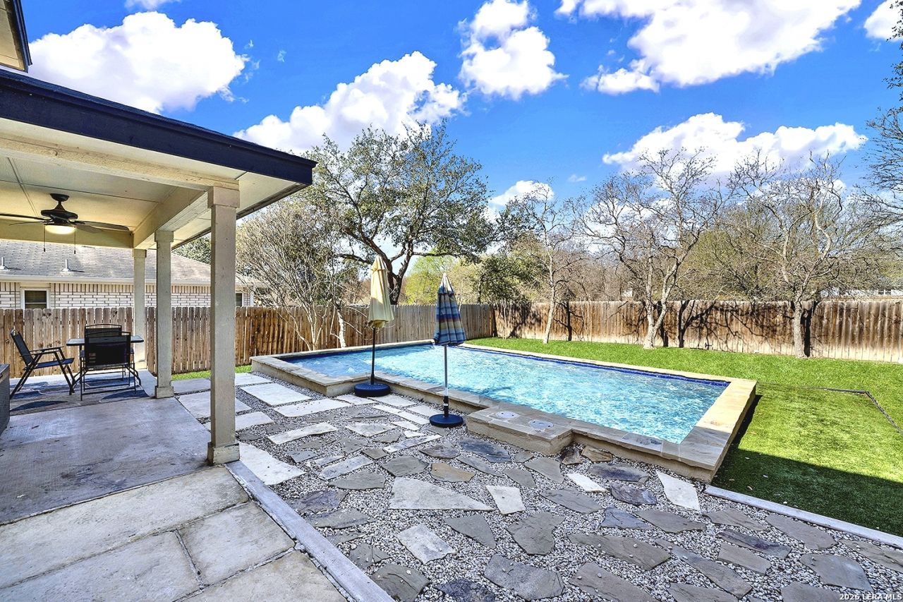 HEATED POOL MORE SWIM TIME!!!! Take a plunge in this amazing 16x25 inground pool surrounded by a beautiful Backyard Oasis with a Greenbelt behind. This home was remodeled in 2021 with a newer HVAC system, textured laminate floors, painted cabinets, granite counter tops, butler pantry in the laundry room, toilets, rain gutters. The inground pool is approximately 3 years old and the fence 2017, Roof and HVAC 2017, hot water heater 2024. Lets not overlook the entry with the high ceilings and stunning fixtures. The Homes location provides easy access to IH 35 to travel around town. Did anyone say BBQ?? Well, the backyard covered Patio will give you that area to do your best, while over looking the pool. The location is very close to Alamo Community College and Methodist Hospital. Includes a transferable foundation warranty. Pictures have been enhanced to show Green Grass..