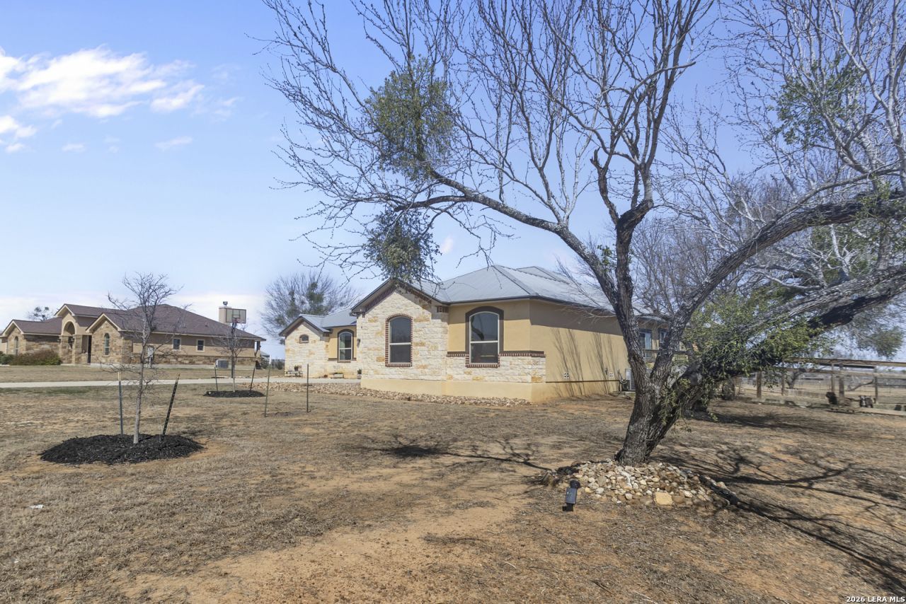 Welcome to 109 Colibro Creek in La Vernia, TX 78121. This absolutely gorgeous single story home sits on a full acre in a quiet one street community with only 12 homes. Offering over 2,700 square feet, this 4 bedroom, 3.5 bath residence is filled with quality details throughout. From the moment you arrive, the oversized metal front doors make a stunning first impression. Inside, you will find an open floor plan with LVP flooring and hand textured walls. The spacious living room features a beautiful fireplace and flows seamlessly into the large kitchen, creating the perfect space for everyday living and entertaining. The kitchen offers a generous island, stainless steel appliances, abundant cabinet space, and plenty of room to gather. The primary suite is a true retreat with a large bedroom and a luxurious bathroom that includes a whirlpool tub, separate shower, dual vanities, and his and hers walk in closets. One secondary bedroom has its own full bath, while two additional bedrooms share a convenient Jack and Jill bathroom. There is also an additional half bath for guests. At the front of the home, you will find a dedicated office space. A large utility room and an extra wide two car garage provide added functionality. This all electric home is built for efficiency with spray foam insulation and a durable metal roof to help keep energy costs down. Step outside to enjoy the covered back patio overlooking a beautiful in ground pool and a spacious backyard with plenty of room to relax or entertain. If you are looking for space, privacy, and quality craftsmanship in La Vernia, this home has it all.