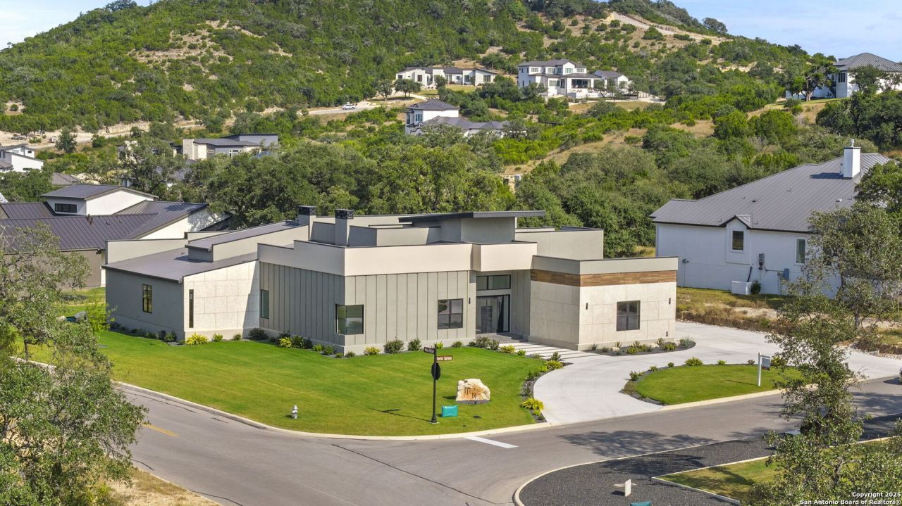 A statement of modern architecture and refined Hill Country living, this custom single-story residence in The Canyons at Scenic Loop is constructed with 2x6 exterior framing, enhanced insulation, and single-slope standing seam metal roofing for superior efficiency, longevity, and clean contemporary lines. Offering 3,719 sq. ft. of intentional design, the home features gallery-height ceilings, expansive walls of glass, and seamless indoor-outdoor connection. The open living space is anchored by a striking feature wall with a linear fireplace, flowing into a chefs kitchen with European-inspired cabinetry, a waterfall black granite island, 48" professional gas range with pot-filler, double ovens, and a hidden walk-in pantry. The owners retreat evokes a spa-like sanctuary with a sculptural soaking tub, oversized glass shower, and warm natural textures. Outdoor living becomes an everyday experience with a resort-style pool and elevated spa framed by water and fire features, covered lounge terrace with fireplace, outdoor kitchen, and poolside shower beneath heritage oaks-where minimalist design and luxury craftsmanship meet at the highest level.