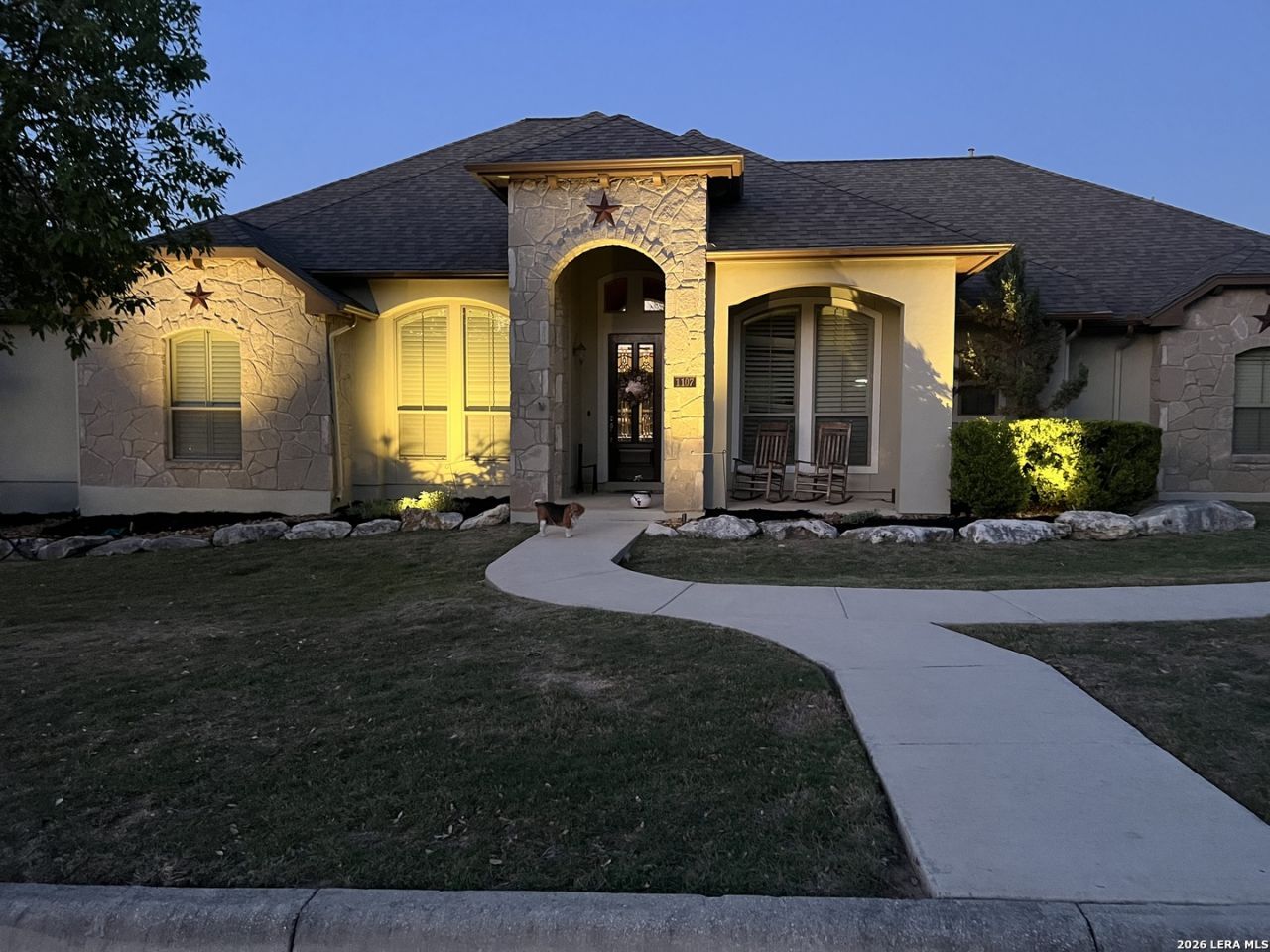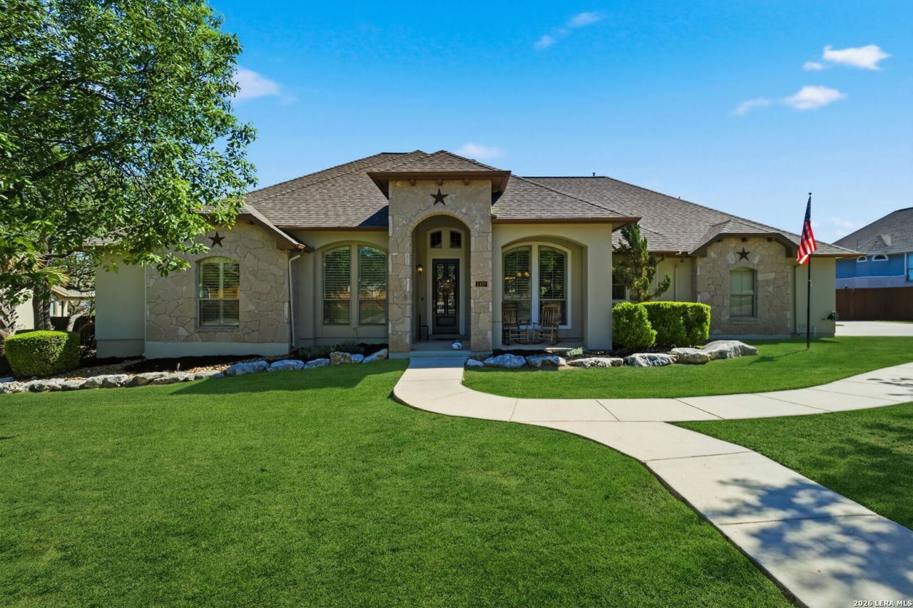 Beautiful 3 Bedroom | 3 Bathroom custom single-story home offering 2,648 sq ft with no steps or stairs, located in the coveted gated community of Clementson Ranch. This elegant residence features formal living and formal dining rooms, along with a spacious family room that opens to a large adjoining kitchen and breakfast nook-perfect for entertaining. The home showcases a stunning bench-style gas rock fireplace, soaring 10-foot ceilings, and ceiling fans throughout. Each generously sized bedroom includes a walk-in closet and its own private bath. The kitchen features granite countertops, stylish glass backsplash, attractive cabinetry, gas cooktop, and gas heating for comfort and efficiency. Situated on a beautiful 1/2+ acre lot, the property is surrounded by tall sweeping majestic oak trees in a peaceful, park-like setting. Spring wildflowers, a garden shed, and planters enhance the Hill Country lifestyle. Enjoy outdoor living on the large patio overlooking the serene backyard, complete with a relaxing hot tub. Additional features include a large utility room with space for a second refrigerator or freezer, a spacious 2-car garage, and a distinctive Hill Country Hacienda feel that blends comfort, charm, and natural beauty. A Select Home Warranty until February 2027 will be transferred to new owner.
