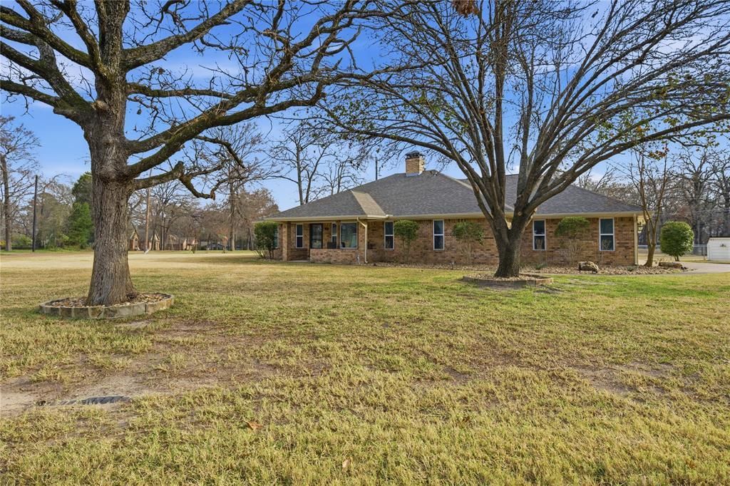 Beautiful 3-bedroom, 2-bath home featuring an open floor plan with a vaulted living room ceiling and a full masonry fireplace. Recent updates include luxury vinyl plank (LVP) flooring, new gutters, updated bath vanities, and recently painted interior. The oversized two-car garage is large enough to accommodate a standard four-door truck and includes a separate storage shop with a A-C vent. The storage area features double doors and is spacious enough to store a golf cart. Situated on three lots, the property offers a new fence and an irrigation system supplied by a private water well. Located in the Enchanted Oaks community, part of Eustace ISD, residents enjoy access to a pool, playground, dog park, boat launch, and designated boat storage areas. This is a rare opportunity that combines space, modern updates, and an exceptional community lifestyle—conveniently located near local shopping and restaurants. Some images have been enhanced for grass & trees. Water well for irrigation only not potable water. Detailed list of property improvements available. Information Deemed Reliable but Not Guaranteed, Buyer's Agent to Verify All Information