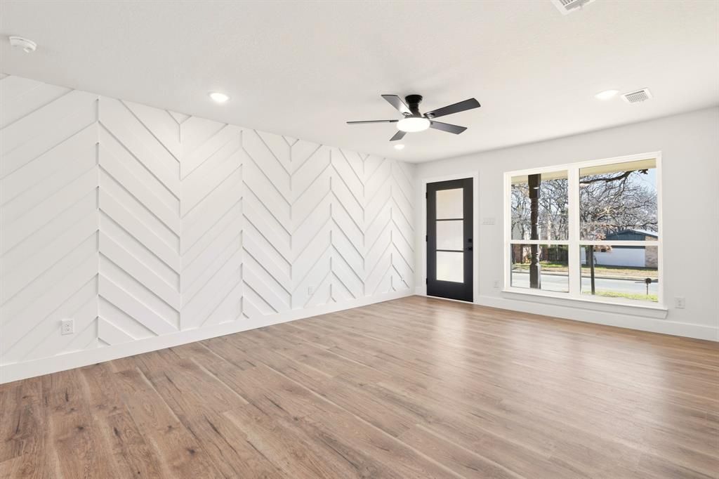 Fully renovated single-story home featuring extensive updates throughout, including new flooring, sheetrock, windows, electrical, plumbing, foundation work, HVAC, and a new roof. The open layout offers a bright living area with a custom accent wall and recessed lighting. The modern kitchen showcases quartz countertops, stainless steel appliances, custom cabinetry, and a center island. Updated bathroom with sleek finishes and beautifully tiled tubshower combo. Spacious backyard with mature trees, covered patio area, and storage shed. Conveniently located near major Hwy 183 with easy access and approximately 15 minutes to downtown Fort Worth.