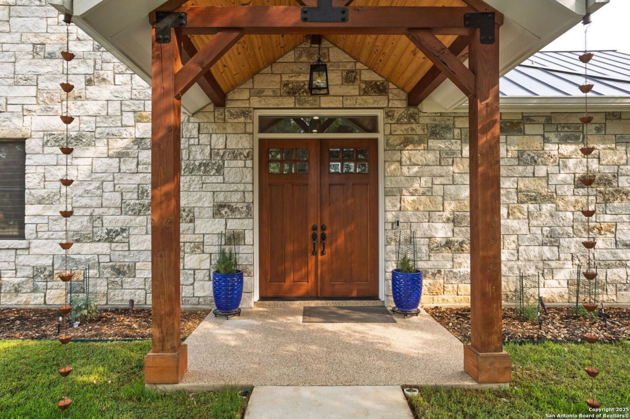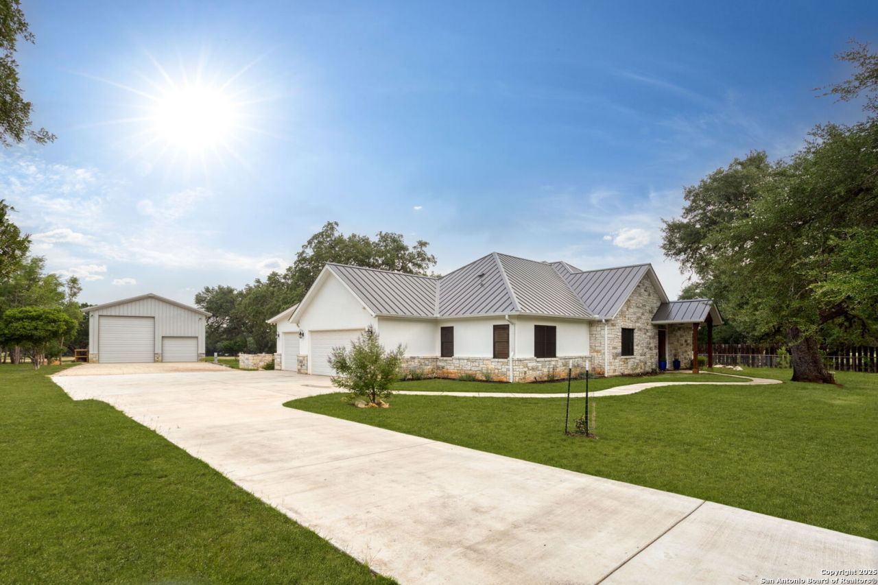 Stunning Custom Home on 2 Acres in Gated Equestrian Community. Welcome to your dream retreat in the prestigious Bridlegate Ranch! This custom 3-bedroom, 2.5-bath home sits on 2 beautifully manicured acres, surrounded by mature heritage oaks, and is packed with luxury upgrades and thoughtful features. Offering approximately 3,210 sq. ft. of living space, the home also includes a 900 sq. ft. oversized 3-car garage and a 1,500 sq. ft. metal building ideal for storage, hobbies, or an RV setup. Step inside through custom 8 knotty alder and mahogany double doors and enjoy the elegance of engineered wood and ceramic tile floors, soaring ceilings with Radiata pine and faux beams, Marvin dual-pane windows, plantation shutters, and built-in surround sound speakers. Every detail has been carefully designed, from the custom built-ins to the hickory cabinetry with quartz countertops and under-cabinet lighting. The chefs kitchen is the heart of the home, featuring a 7-burner ZLINE gas range, 8-foot island, double electric ovens, pot filler, wine fridge, trash compactor, double-drawer dishwasher, and an oversized walk-in pantry-a true dream for any culinary enthusiast. The spacious great room features a stunning all-masonry wood-burning/gas fireplace with a Cypress mantle, flowing into a bright dining area and out to a covered back patio-perfect for entertaining. The primary suite is a luxurious retreat with a boutique-style walk-in closet, complete with a center island and custom built-ins. The primary bathroom features a stunning floor-to-ceiling polished porcelain walk-in shower and a deep soaking tub-perfect for unwinding after a long Texas day. A well-appointed laundry room includes a sink, folding counter, and a custom dog wash station. The home is wired for full indoor/outdoor surround sound and offers a fenced backyard, sprinkler system, and oversized garage with epoxy floors. A standout feature is the fully equipped 1,500 sq. ft. metal RV barn with full hookups and its own washer/dryer connections-ideal for RV storage, a workshop, or home business. Located in the gated Bridlegate community, residents enjoy access to two resort-style pools, a fitness center, tennis courts, equestrian trails, river park access, guest accommodations, and more-all set against the scenic backdrop of the Texas Hill Country. This home offers the perfect blend of privacy, luxury, and lifestyle. Dont miss your opportunity to own this one-of-a-kind Hill Country haven!