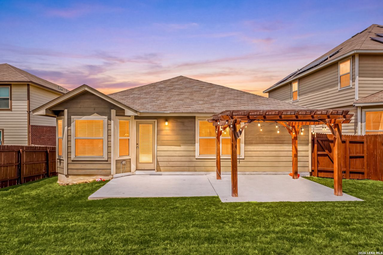 This pristine single-story home sits atop a hill, offering exceptional curb appeal and the added benefit of a constant, refreshing breeze that keeps the home feeling calm and comfortable year-round. Thoughtfully insulated, the home stays naturally cool, reducing the need to rely heavily on air conditioning and enhancing everyday comfort. Upon entering, youre welcomed by an open-concept layout featuring tall ceilings, abundant natural light from numerous windows, captivating lighting fixtures, soft neutral tones, and on-trend laminate flooring that flows seamlessly throughout the main living areas. The kitchen shows like a model home and is beautifully appointed with granite countertops, stainless steel appliances, a designer backsplash, and crisp white cabinetry paired with dark hardware-creating an ideal space for both everyday living and entertaining. The split primary suite offers privacy and features a spacious walk-in closet along with a sleek ensuite bath complete with dual sinks and a large walk-in shower. A versatile home office with French doors can easily serve as a gym, fourth bedroom, or flex space tailored to your needs. Step outside to a nicely sized backyard featuring a custom pergola-the perfect spot to enjoy your morning coffee or unwind after a long day while taking in the peaceful surroundings. Two-car garage. Wonderful amenities to enjoy including neighborhood pool, park, and basketball court. Zoned for Medina Valley Schools. Conveniently located with easy access to major routes, Lackland AFB, Dove Creek Shopping Center, and a multitude of resturants and dining options. Dont miss the opportunity to own this tranquil, practical, and beautifully maintained home.