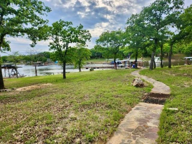 Amon G Carter Lake LAKEFRONT 1.85 Acre lot on a corner with a BOAT DOCK and 300 ft of shoreline. This lake house is on the North side of the lake and in one of the best fishing coves on this lake and it is across from the GOLF COURSE! There is no HOA and no restrictions. This home is on a corner and has road access . There is a lato two streets. Lake view from all rooms of the home with a wall of windows across the back of the home. There is a separate guest suite with its own entrance and full bath and small kitchen and closet. There is a huge greenhouse with concrete floor and electric and water. The lot has had dirt work to level and slope and it has many mature oaks and landscaping and a large front and side patio area. The main living area has an Austin stone fireplace floor to vaulted ceilings. This is a RARE find with the amount of land and on the best side of the lake and in this great cove and across from the golf course with a boar dock. The house has two bedrooms and two baths. RARE set up on Amon G Carter lake. Across from Golf Course, Close to Hwy 287, Fairly constant level lake, Fishing Lake, Great Location! Rare find!