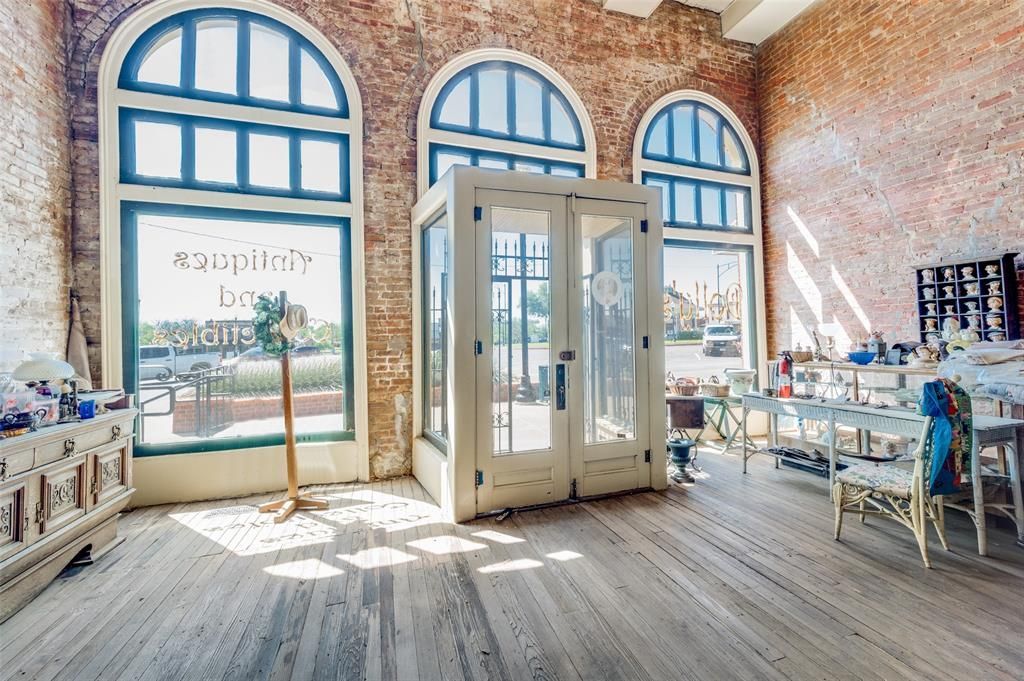 On the Pilot Point Town Square, at the corner of Jefferson and Liberty, Dolly's Antiques and Collectibles building has proudly served the local community for over 100 years! The brick and plaster facade are still welcoming with the large custom windows inviting passersby to come on in. As you enter, the original wood floors and weathered brick walls take you back in time. The opportunity for today's customer is vast with the enormous space for shopping, dining, or whatever business you envision. There is a generous sized storage room in the back of the building, with an entry*exit door that opens to the side street of the building, perfect for loading and unloading goods. Two bathrooms are also a bonus for a possible restaurant*retail site. Upstairs you will find more space to enclose or use as part of the business model. The balcony overlooking the area below is quite striking and offers several great options for use of space. Also, 3 doors to the north, 109 S Jefferson is a available for sale. Boundless possibilities in booming and historic Pilot Point!