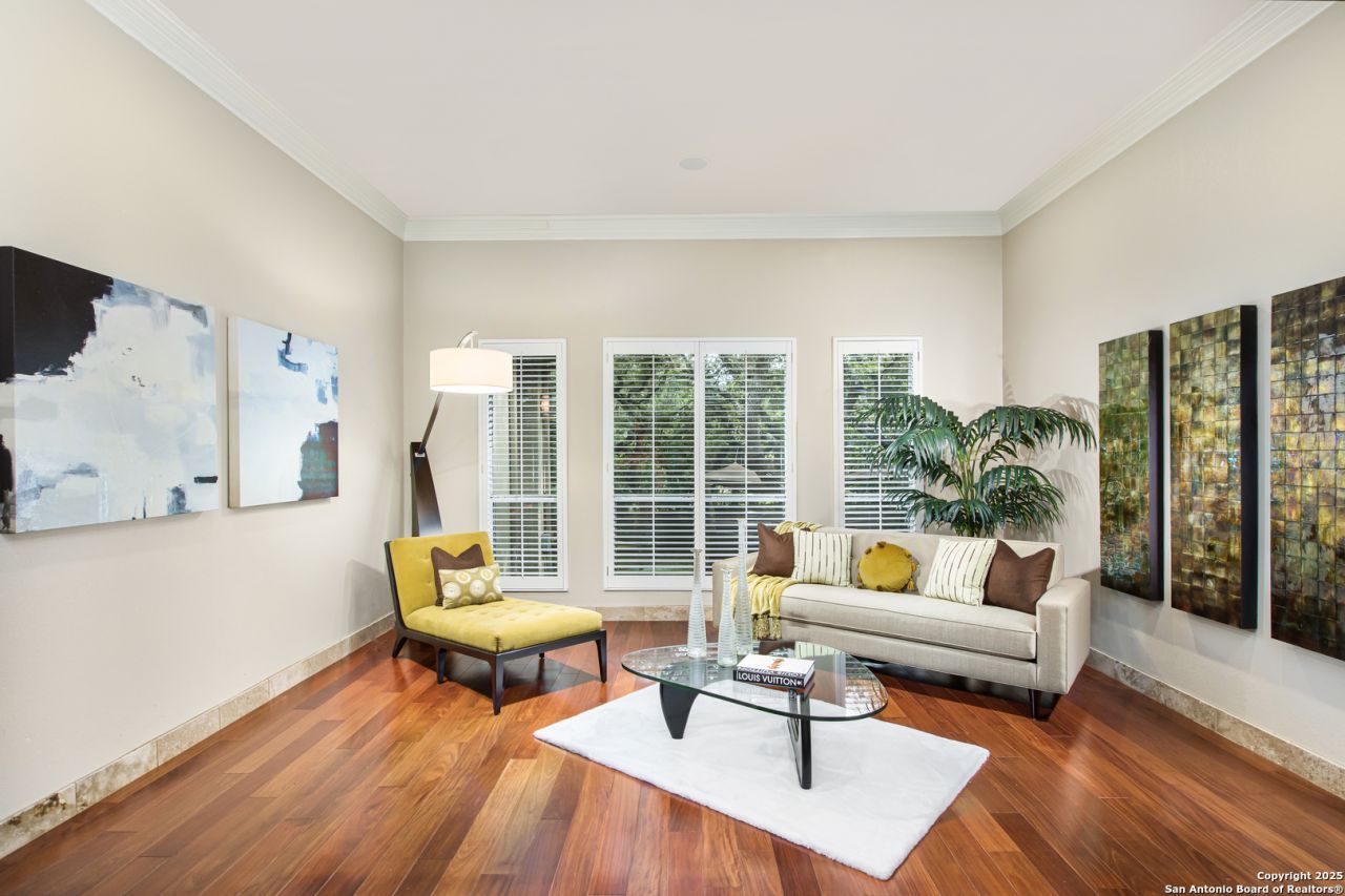 A sanctuary of elegance nestled within the coveted Elm Creek Subdivision. This 4-bedroom, 3.5-bathroom home radiates a perfect harmony of style, comfort, and luxury. Inside, a welcoming foyer opens to a rich ensemble of spaces filled with natural light. Follow the gleaming travertine floors to a formal dining room, resplendent in its sophisticated details. The spacious living room, anchored by a charming wood-burning fireplace, offers a warm and inviting setting for intimate gatherings and entertaining. The gourmet kitchen stands as the heart of this home, outfitted with stainless steel appliances, abundant counter space, and a generous island perfect for meal prep and casual dining. An adjoining breakfast area harmoniously connects the kitchen to a tranquil backyard retreat. The master suite provides a restful sanctuary, complete with a spa-like en-suite bath designed for relaxation and renewal. The additional bedrooms continue this theme of serenity and softness, offering comfortable spaces for family and guests alike. Outside, a beautifully landscaped backyard and a covered patio create an ideal spot for al fresco dining and entertaining, while a two-car garage adds convenient storage and parking. Located near top-rated schools, desirable amenities, and with easy highway access, this home is your key to experiencing all the best San Antonio has to offer.