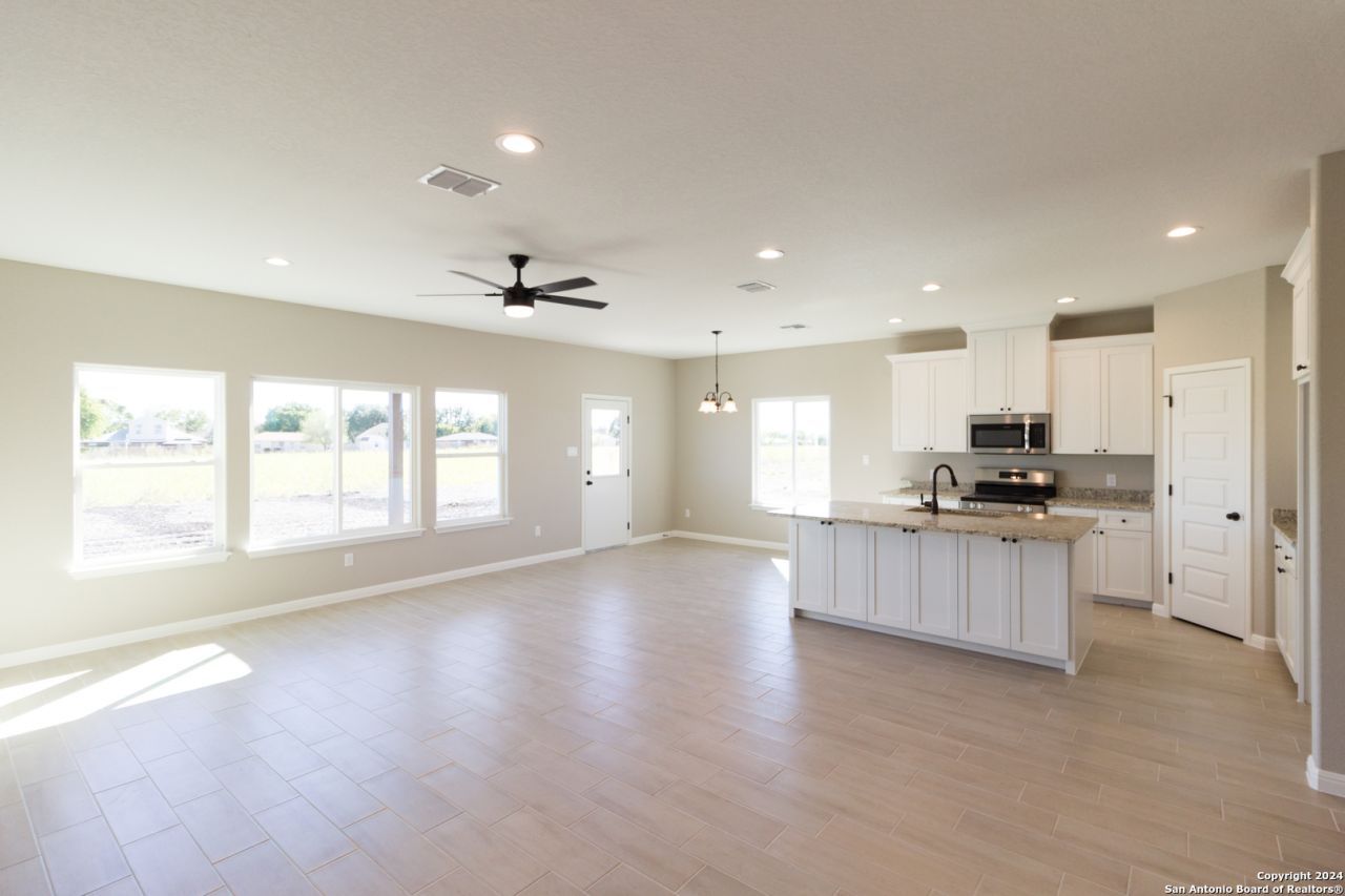 MOVE-IN READY! This new custom 1658 SqFt. home conveniently located in Marion Park (Marion, TX) offers 3 bedrooms, 2 full baths, plus an office (or 4th bedroom!). Located on a level 0.172 acre lot in quiet countryside within Marion ISD- just minutes from I-35 and I-10. Features NO HOA and high-speed fiber internet is available! Spacious floor plan with 3 bedrooms 2 full baths plus an office/4th bedroom. Luxurious master suite boasting a walk-in closet, walk-in tile shower and double vanity. High 9 ceilings and granite countertops throughout the home. Kitchen with oversized island, custom wood cabinets, walk-in pantry and dining area. Wood-look tile flooring in wet areas, living room, and master bedroom with upgraded patterned carpet in the bedrooms and closets. This home includes upgraded features- worth about $10,000-$15,000 value! Exterior of home has stone 42" tall across the front of the home and hardi-plank batten board. Includes full front, side and back yard landscaping as well as a sprinkler system. Covered back porch perfect for entertaining with TX summer BBQs! Ask us about other homes under construction- or build on an available lot! Experience Affordable Luxury with Olin Johnson Homes- a trusted custom home builder with 25+ years of experience.