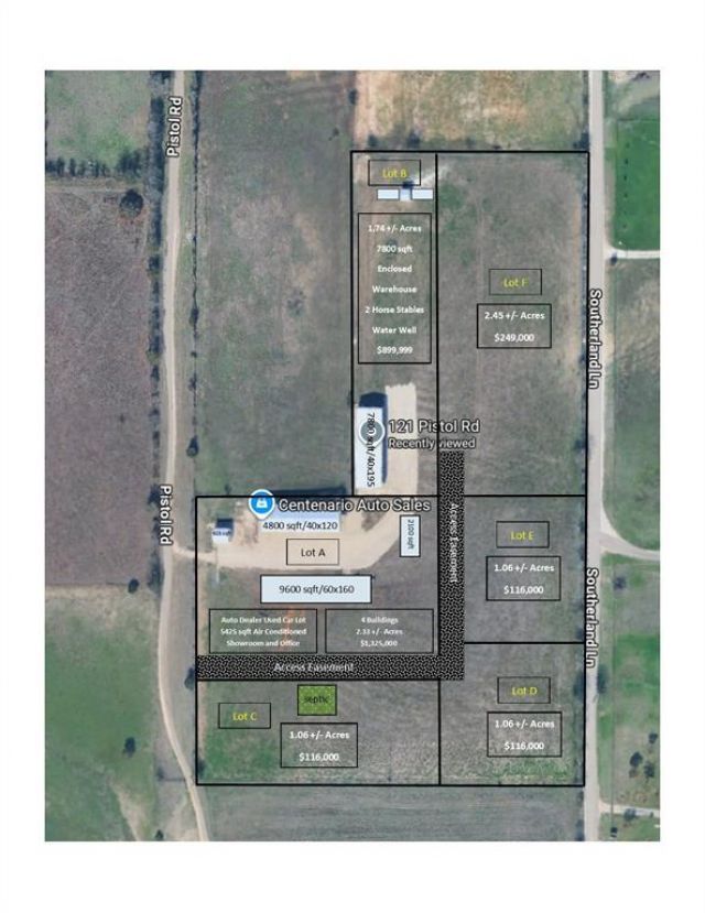LOT B – WAREHOUSE - CONTRACTOR YARD - IOS - NO CITY ZONING RESTRICTIONSSize: ±1.74 AcresInvestment or Owner-User Opportunity - Warehouse - IOS - Contractor YardImproved flex industrial warehouse with yard, well-suited for contractors, service businesses, and industrial outdoor storage users.±7,800 SF enclosed warehouse Two offices and restrooms Overhead doors and concrete slabs, Fenced and gated outdoor storage yard, Electric and Water. Additional feature includes 4 horse stalls, offering optional agricultural or hybrid use. Investor profile: High-demand small-bay industrial with yard component for industrial outdoor storage (IOS). Owner-user profile: Functional facility with expansion capability and flexible use.Located at 121 Pistol Rd in Weatherford, this 9.95 acre commercial development is offered as six individual lots rangingfrom ±1.06 to ±2.45 acres. Positioned in unincorporated Parker County just off Veal Station Rd, the property benefitsfrom no zoning, no city entitlements, and minimal development restrictions, making it ideal for industrial outdoorstorage, contractor yards, flex industrial, automotive, and service-based users. The area is experiencing rapid growthdriven by residential expansion and increasing demand for small-bay industrial, yard space, and contractor-orienteduses. This offering is well-suited for both owner-users seeking operational flexibility and investors targeting high demand, low-supply IOS and light industrial assets. Ownership offers build-to-suit capabilities, allowing customizationfor office, warehouse, service, or hybrid applications. Rare opportunity to secure flexible-use land in a high-growthcorridor with strong long-term upside.