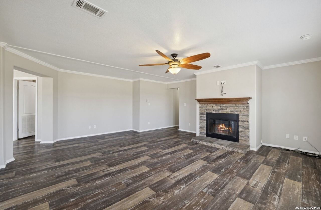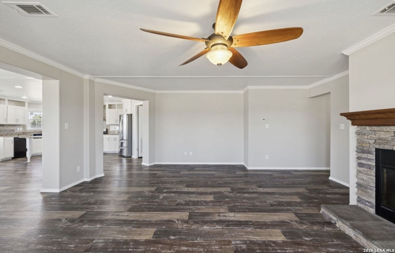 Beautiful doublewide manufactured home available, built in 2017 located in the East Central area only minutes from the Calaveras Lake. This home features 3 spacious bedrooms, 2 full bathrooms, with a separate laundry room, all inside has been freshly painted, has modern ceiling fans in all rooms, updated light and water fixtures throughout, central air unit, real wood fireplace in living room, 1800sqft, open floor plan in the living, dining and kitchen areas, you will love the gorgeous granite counters in the kitchen with tiled matching backsplash, perfect size kitchen island, white custom cabinets with stylist hardware, farm style kitchen sink, stainless steel appliances, washer, dryer and refrigerator convey. The bathrooms come with granite counters matching the rest of the home, both bathrooms have white custom cabinets, a generous primary bathroom space, with his and hers vanities, stand up shower and an updated white garden tub to enjoy and walk-in closet. Home sits on .81 lot size, new privacy fence on backside of house and other sides have chain-link fencing, the gazebo is on a cement slab great for entertaining guests. Last but not least; the medal 25 x 35 powered workshop with newly insulted 110 & 220 outlets great for workshop usage and or storage. If youre looking to live in a secluded area where you can enjoy quiet stillness nights while minutes away from busy downtown San Antonio, Lavernia and Floresville, this is the perfect home for you. Seller is motivated!
