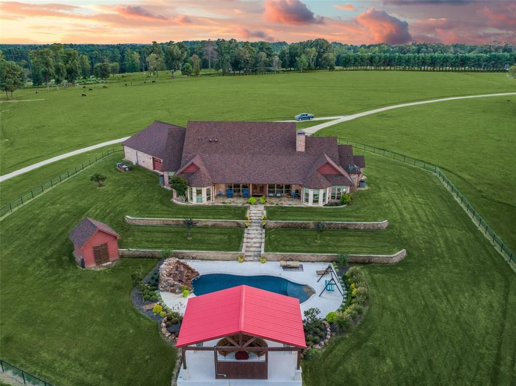 Discover this Unbelievable Property with 168 Acres of Pristine Pasture Land! Prime location right off HWY 757 and centrally located between Tyler and Longview with only a 1.5 hour drive to downtown Dallas. Meticulously maintained with 3 large rolling pastures with irrigation, tiered level pool oasis, 7 acre private pond and dock stocked by a 50 gal-per-min 5hp 450 ft well, 2 additional smaller ponds, working cattle pens and corral, and 2 barns with office spaces and workshops. Custom 3 bedroom home with quality craftsmanship and high attention to detail offering walls of windows with panoramic views of rolling pastures. Step outside to the lushly landscaped tiered backyard retreat with a resort pool and spa with waterfalls, pergola with outdoor living and enjoy the most beautiful Texas sunsets. Recent improvements include extensive land clearing, landscaping, new pergola and outdoor kitchen, and whole house Generac! Options for cattle grazing, hay sales, and other livestock, this working ranch offers comfort and success in the heart of East Texas with multiple business opportunities. Seller open to subdividing options! See attached list of full improvements and features!