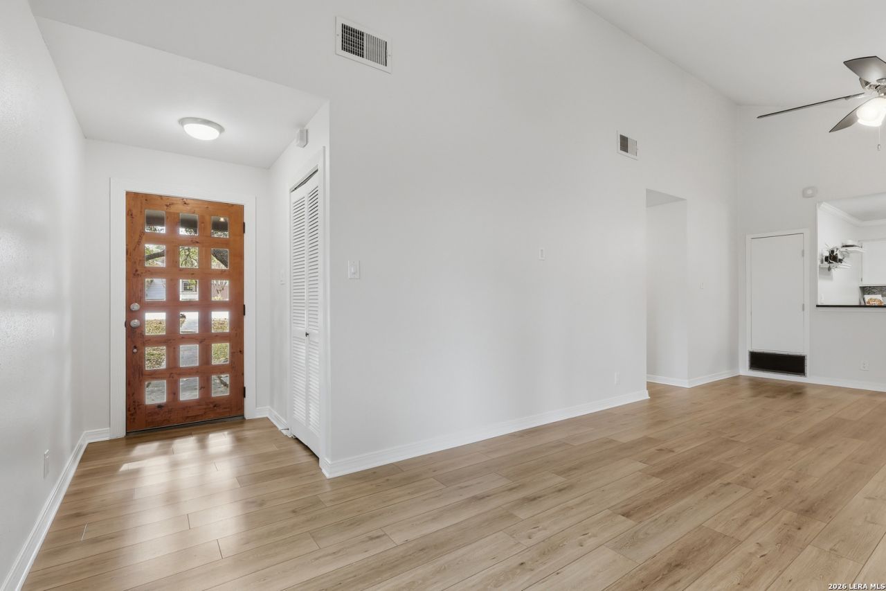Come see this light-filled single story home on a corner lot on a cul-de-sac street! Mature live oak trees provide beauty and shade for outdoor enjoyment and lovely views from inside this move-in ready home. An open floor plan makes entertaining a breeze. The living/dining room has soaring ceilings, a gas fireplace with gas logs. and French doors that open onto a large covered patio/entertainment area. The kitchen features granite countertops, a large stainless steel sink, a decorative tile backsplash, and a refrigerator that remains with the home. The primary bedroom also features high sloped ceilings. The updated ensuite bathroom has a shower with floor-to-ceiling tile, a custom glass enclosure, and a rain showerhead. The closet has custom built-ins and the toilet area has a sliding door for privacy. The secondary bedroom can be utilized as a bedroom, a home office, a workout room, or perhaps a study. A second full bathroom is across the hall and has been updated with a new vanity, LED bathroom mirror, and new fixtures. The two-car rear-entry garage includes an area for laundry, with a washer/dryer that will remain, and a built-in workbench. In addition to new paint in the last few weeks, you can see a detailed list of upgrade highlights in additional information. Castle Hills Forest has a voluntary HOA and an option for residents to join the swimming pool and tennis/pickleball courts. This centrally located home is close to Hardberger Park, Alon HEB, and the JCC and 15 minutes to the airport, The Shops at La Cantera, and the Medical Center. 20 minutes to the Pearl and Downtown.