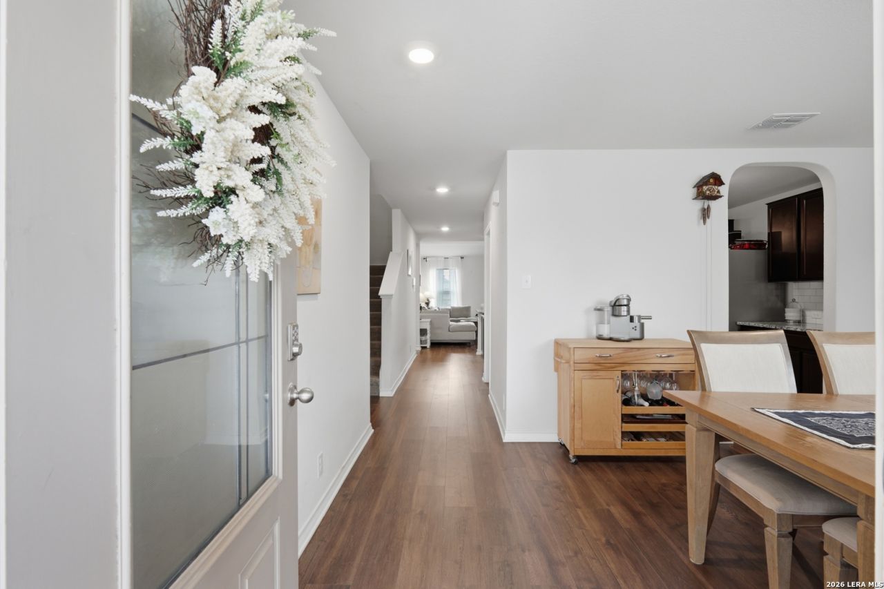 *USDA ELIGIBLE/VA ASSUMABLE LOAN FOR VA BUYERS* Spacious two-story home on a corner lot offering a functional open floor plan with five bedrooms and a versatile layout. The main level features the primary suite for added privacy, complete with a full bathroom that includes a soaking tub, separate shower, and double vanities. The living area flows seamlessly into the kitchen, where you will find stainless steel appliances, granite countertops, gas cooking, dark cabinetry, a clean subway tile backsplash, and a large island with breakfast bar seating, all complemented by recessed lighting throughout. Upstairs, four additional bedrooms are paired with a generous loft space that can easily serve as a game room, media room, or home office, providing flexibility to fit a variety of needs. The backyard sits on a larger lot and is designed for both relaxing and entertaining, featuring a covered patio and privacy fence. Located in a community with impressive amenities, including two pool areas, a lazy river, water slide, tennis courts, sports court, clubhouse, and playgrounds. Conveniently positioned with easy access to Loop 1604, a short commute to Lackland Air Force Base, and close proximity to Northwest Vista College, this home offers both space and location within the highly regarded NISD school district.
