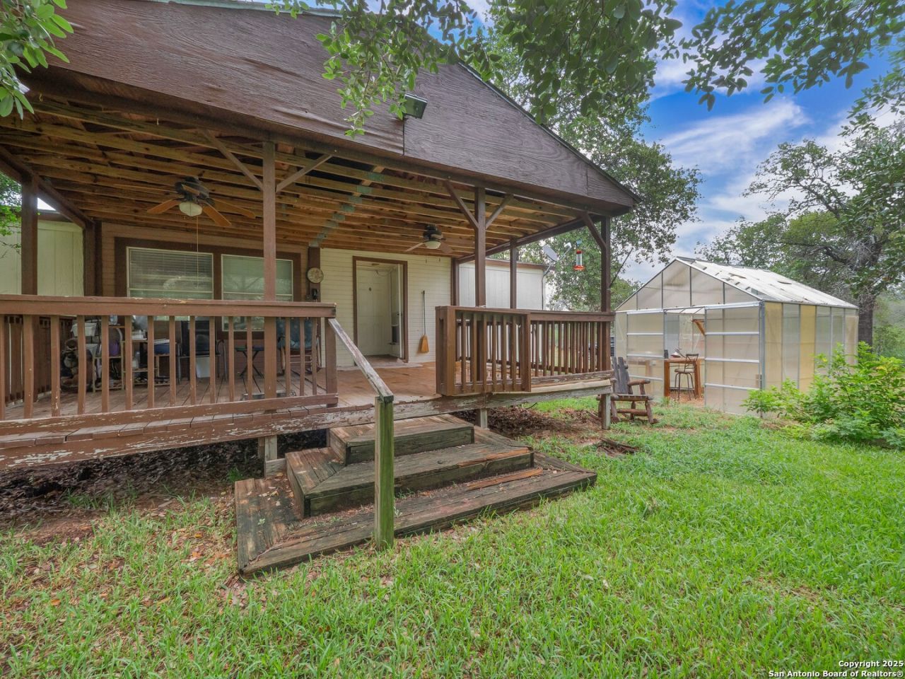 This 3-bedroom, 2-bath home offers 1,920 sq ft of living space, situated on a sprawling 8.42-acre lot. The layout includes a covered 14 x 24 front porch and a partially covered 12 x 24 back porch -ideal for enjoying the surrounding wildlife and the shade of a majestic oak tree. Cozy up by the double-sided wood-burning fireplace that warms both the living and formal living areas. Enjoy the charm of original finishes throughout, complemented by new carpet in the bedrooms and well-maintained flooring throughout the rest of the home. The spacious owners suite features an ensuite bath with a walk-in shower, separate vanities, and a jetted garden tub - creating a private retreat for relaxation. A patio deck at the back of the home, accessible from the dining area, offers the perfect spot for entertaining or simply enjoying the peace and quiet of the outdoors. Ideal for hobbyists or those needing storage, this property features a 16 x 20 detached garage with workshop, complete with power, water, and A/C. Additional outbuildings include two large carport-style metal structures (28 x 35 and 30 x 45, tall enough for RVs or boats) and two storage sheds. A utility-ready hot tub pad with power is in place. All appliances stay, and utilities include city water, Medina Electric, propane for the water heater and gas stove, and electric for everything else. Key updates include a 2009 roof, 2015 A/C unit, and a 7-year-old water heater. A versatile property with room to grow, live, and explore.