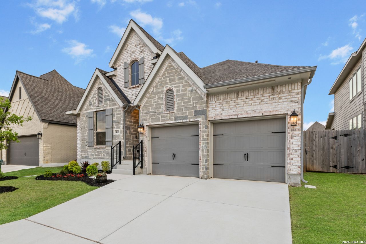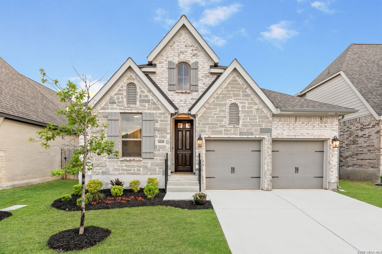 Welcome to 14146 Blind Bandit Creek in the highly desirable Kallison Ranch community. This extensively upgraded single-story home, built in 2021 has 4-bedrooms and 3 full bathrooms with 2,172 sq ft of bright, open-concept living designed for everyday comfort and effortless entertaining. At the heart of the home, the gourmet kitchen features 42" custom cabinetry accented by designer oil-bronzed hardware and crown molding, enhanced with oversized pull-out drawers, under-cabinet LED lighting, bronze-finished pendant lighting at one of the two islands, a designers touch herringbone backsplash and engineered stone countertops with a bull-nosed edge. A suite of GE stainless steel smart appliances, including a remote-controlled hood over gas range, completes the space, and the Whirlpool stainless side-by-side refrigerator conveys. In addition, the laundry room includes an LG smart washer and dryer which also conveys with the sale of the home. The elevated and freshly painted interior includes oversized wood-plank tile flooring in the main living areas, upgraded carpet with premium padding in the bedrooms, custom faux-wood blinds, and a convenient built-in mud space with hooks and storage. Retreat to the spacious primary bedroom with luxurious, spa-inspired ensuite featuring dual vanities, an oversized garden tub, and custom walk-in shower with built-in bench. Enjoy modern convenience with smart-home upgrades such as an ADT security system with Google Nest, integrated interior and patio speakers, CAT6 Wi-Fi boosters, and additional data wiring. The exterior of the home is warm and inviting with an upgraded mahogany front door, four-sides brick and stone masonry and includes a full gutter system, RainBird smart irrigation and fresh landscaping. The garage boasts easy-maintenance epoxy flooring. The oversized covered patio is ready for hosting-complete with two built-in outdoor speakers and a dedicated GFI with 4-circuit + CAT6 wiring, ideal for a future hot tub or outdoor kitchen-all backing to a peaceful greenbelt for added privacy. Kallison Ranch residents enjoy an amenity-rich lifestyle with two resort-style pools, cabana lounging areas, two parks with playgrounds, a plentiful dog park, catch and release fishing pond with meandering ducks, covered pavilions for grilling, dining and gathering, and lush green spaces throughout. Enjoy the beauty that this lovely home and community have to offer!