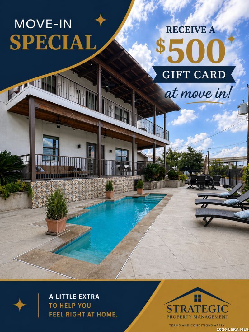 Want to keep more cash in your pocket? Ask about our deposit-free option through Obligo so you can skip the traditional security deposit and move in with less upfront cost! **MOVE-IN SPECIAL! $500 GIFT CARD IF SIGNING A LEASE WITHIN 48 HOURS OF A SHOWING!** *** Electric, gas, water, and trash services are included in the price! Welcome to your new home in the heart of San Antonio, TX. This 2-bedroom, 2-bathroom residence is an inclusive gem in a gated community, offering a blend of comfort and style. The high ceilings, custom window coverings, and stained concrete floors create a modern and sophisticated atmosphere. The kitchen is a chefs dream with custom cabinets, granite countertops, a gas stove, and energy-efficient stainless steel appliances, including a refrigerator. The tile backsplash adds a touch of elegance. The home also features a brand new central HVAC system, ensuring your comfort in all seasons. The bedrooms are spacious, with custom-designed walk-in closets for your storage needs. The bathrooms are equally impressive, with walk-in showers, vessel sinks, and a rain shower in the primary restroom. The home also includes a washer and dryer, ceiling fans, and a chandelier for added convenience. The community offers a pool, covered parking, and trash services. The location is unbeatable, near downtown, the UTSA campus, and The Pearl. Shopping is just a stones throw away, and the covered patio is perfect for relaxing after a long day. This home is a perfect blend of luxury and convenience, waiting for you to make it your own. **Residents are automatically enrolled in our RESIDENT BENEFIT PROGRAM, which includes A/C filters delivered to your door PLUS many other monthly value adds ($60.95 MONTHLY FEE). Please ask us for a list of benefits. The $60 app fees are non-refundable.** **Electric, gas, water and trash services included in the price.**
