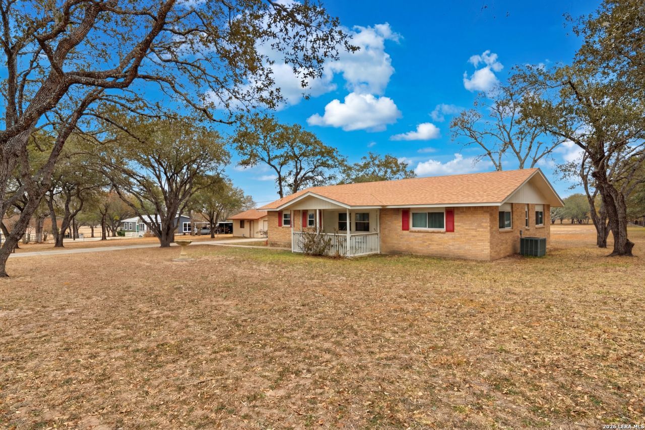 Discover the perfect blend of charm, comfort, and natural beauty in this 1,309 sq. ft. brick home featuring 3 bedrooms and 1.5 baths. Situated on a sprawling 2.765 acre mature tree lined lot, this property offers space, privacy, and tranquility just minutes from town. Recent updates include fresh interior paint, new flooring, and a beautifully tiled walk in shower. The detached garage includes an attached workshop, plus an additional flex space with window unit climate control, ideal for a home office, gym, or hobby room. Enjoy a gorgeous expansive backyard perfect for relaxing or entertaining, surrounded by mature shade trees and enhanced by pecan trees. Additional features include, concrete driveway with decorative gate, and no HOA. Located only minutes from the highly sought after La Vernia ISD and local amenities. Whether you are seeking peaceful country living, room to grow, or a versatile investment opportunity, this property offers endless possibilities. Do not miss your chance to make this unique retreat your own.
