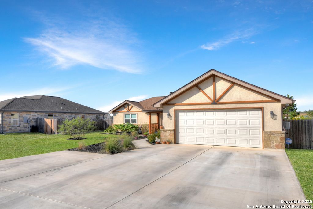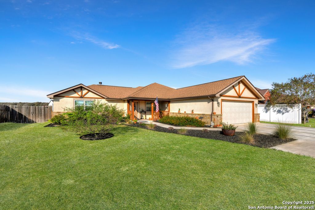 Come watch the beautiful sunsets in the countryside! Wonderful rock and stucco home with 3 bedrooms and 3 baths! Master Suite has easy low step in shower. Two living areas set up for ease of multi-generational living. Great backyard for relaxing with covered patio, nice landscaping and above ground pool with deck. Tile throughout home, neutral colors, and high ceilings. Open floor plan and two eating areas make this home great for entertaining. Garage converted to Mother-in-law Suite with separate entrance and bath. RV electrical outlet/hook up. Extra wide driveway. Acclaimed La Vernia schools, and easy commute to San Antonio. Come see what country living feels like!