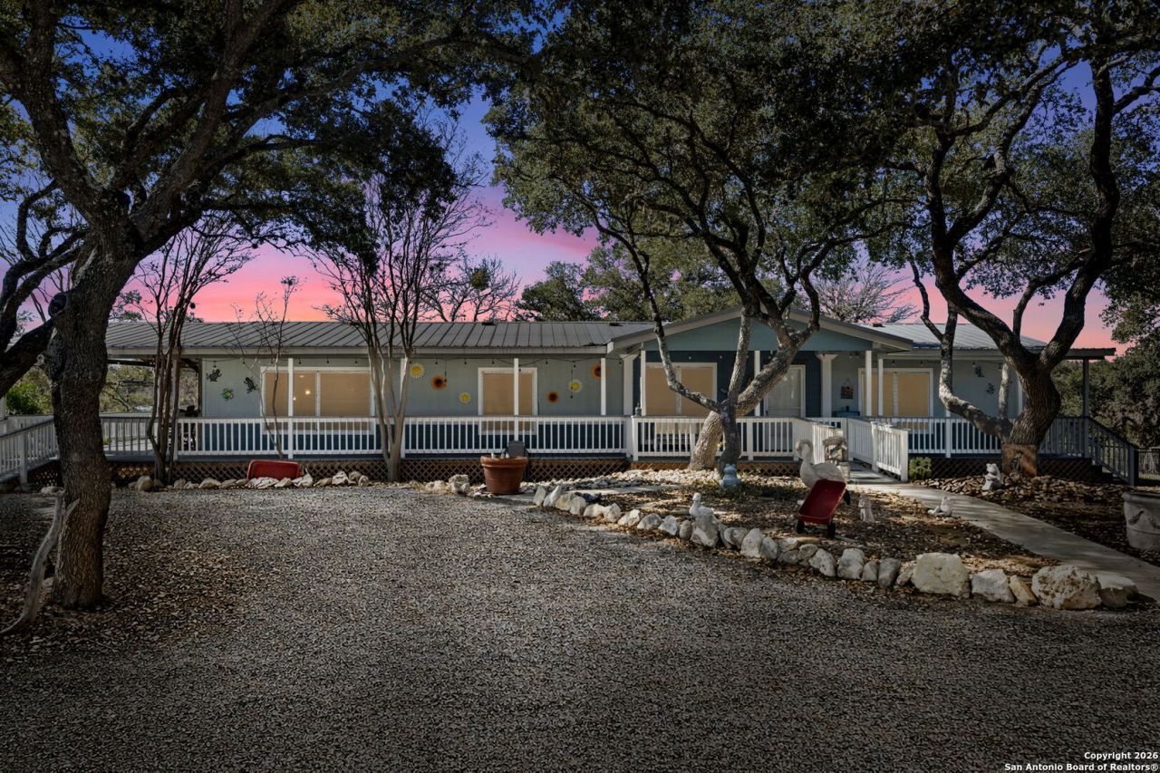 Waterfront living on Medina Lake sets the stage for this fantastic home ready to make your own. When lake levels are up, enjoy direct access to the water just steps from the large covered wraparound deck; during lower levels, take in sweeping Hill Country views and the expansive lakebed playground. Inside, an open floor plan showcases a spacious kitchen with a large island, abundant cabinetry, and a window above the sink perfectly positioned to capture the scenery, while walls of windows surrounding the living, dining, and kitchen areas fill the home with natural light. The primary suite offers a peaceful retreat with a luxurious ensuite bath featuring dual vanities and a large walk-in shower, complemented by three additional bedrooms that provide ample flexibility for family, guests, or work-from-home needs. A detached oversized garage accommodates outdoor toys with ease, and an RV pad with full hookups just outside the garage adds exceptional convenience for lake life and travel enthusiasts. **pictures with water in the lake are from when the lake was full**