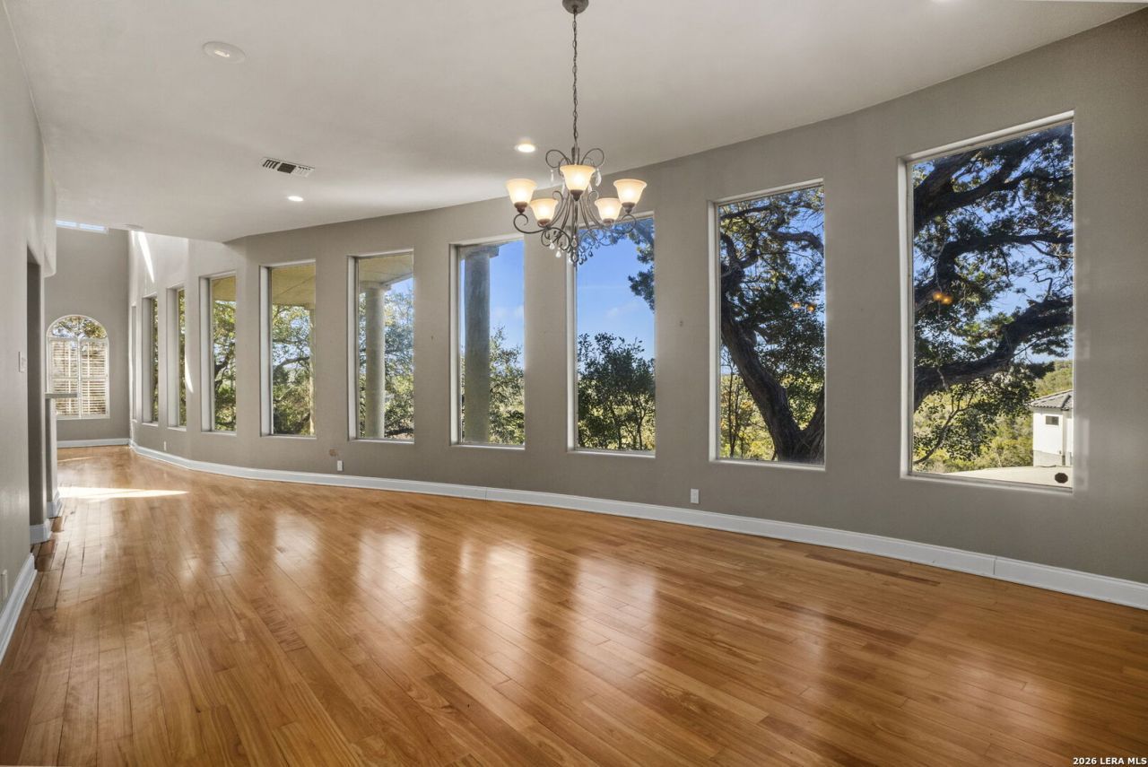 High on a hill with miles of panoramic views, this home showcases spectacular architectural details and grand open spaces, ideal for entertaining including a circular gathering wet-bar while capturing the majestic Hill Country scenery. The interior features beautiful Canadian maple wood flooring and a kitchen tailored for the aspiring chef, with a Thermador gas cooktop and abundant cabinet and counter space. The primary suite is a true oasis with a cozy fireplace, private balcony with unparalleled views, and a luxurious spa-like bath. The family room features walls of custom cabinets and a fireplace. Also a dedicated easy access study with a wall of custom shelving. Outside, a private backyard overlooks mature trees, offering a serene retreat. An oversized 2-car garage is complemented by an additional workshop area that could be finished as a media room or casita for guests.