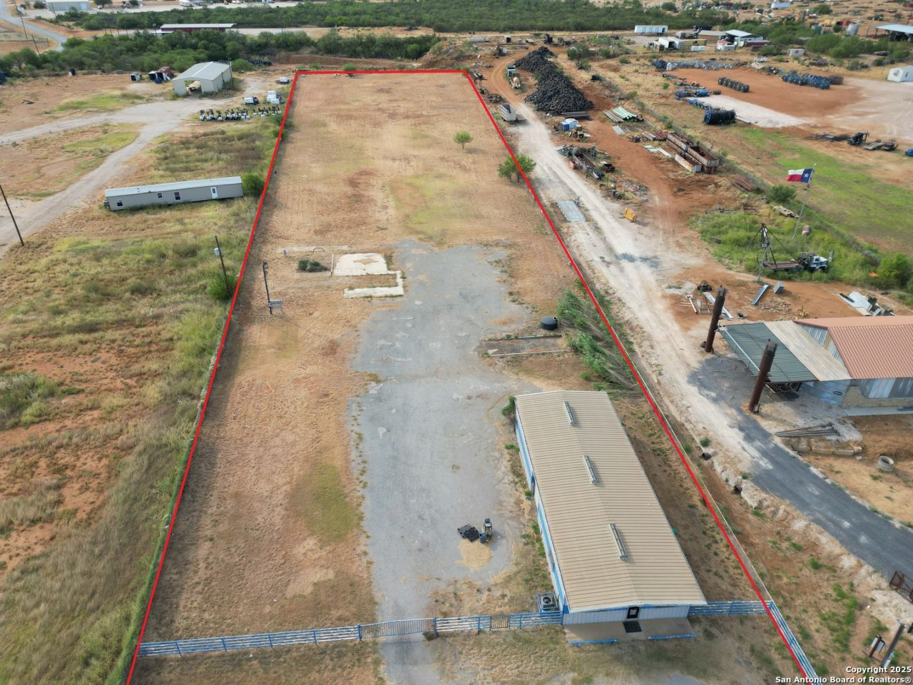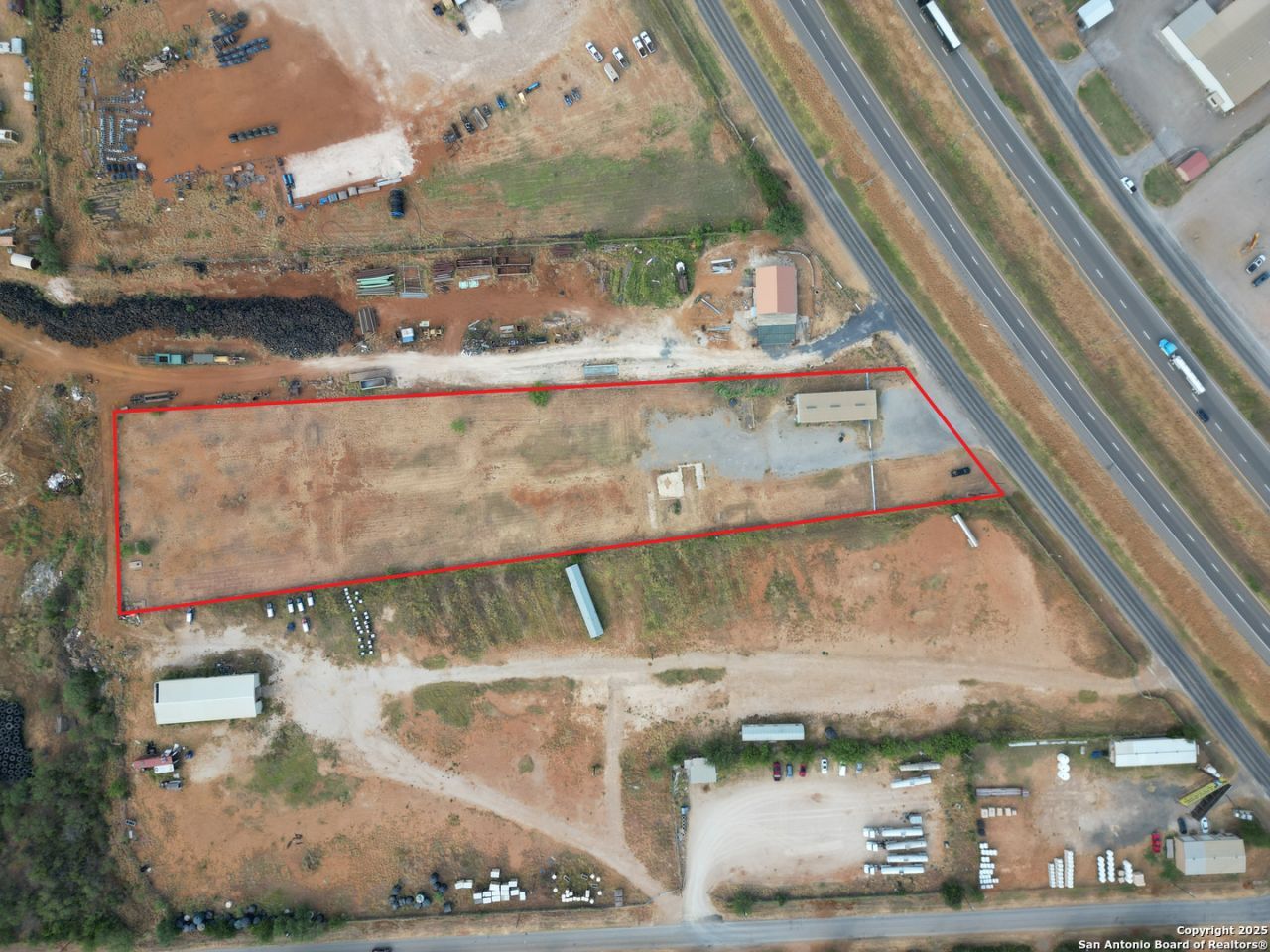 For sale in Dilley, TX is 3.52 acres of I-35 frontage with a 2,600 sf building. There is approx. 178 of road frontage that is in between FM 117 and Hwy 85 on the west side of I-35. There is also a wash bay, RV hookups with septic/water/and electric on the property. The front of the property has a metal pipe fence that beefs up security and there is also an alarm system that is already installed in the building. The building is set up to hit the ground running for your company with an office, kitchen, warehouse/workshop, and two large roll up doors.