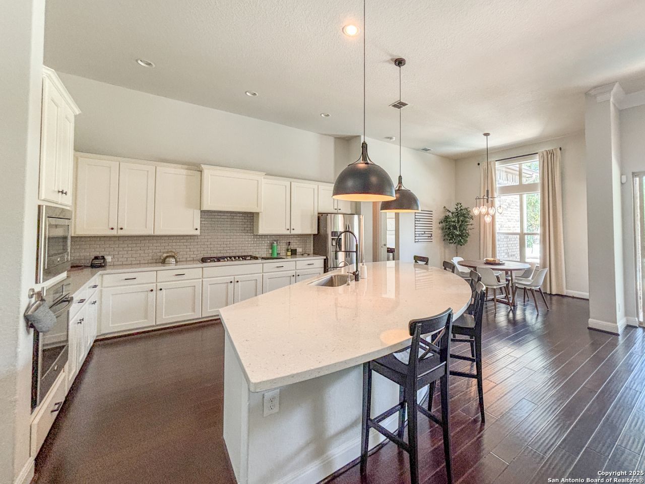 This 5 bedrooms 4.5 bathroom house comes FURNISHED and EQUIPPED offering your family a great opportunity to start living in confort and style since the first day you moves in. Great location in Shavano Highlands, with easy access to IH-10 and the shopping are of La Cantera and The Rim at la Cantera, the Medical services and amenities in the Sonterra area, just minutes from Hwy 281 and the airport. Kitchen equipment, linen and towels, your own media room, pool and yard services are included in the rent. Cov