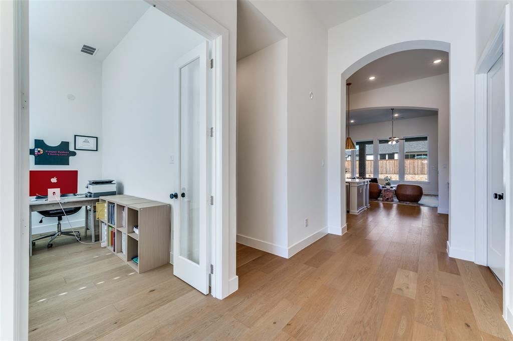 Welcome to this beautifully upgraded one-story Highland Home in the highly sought-after Cambridge Crossing community. Designed with a desirable three-way bedroom split, this home offers privacy and flexibility, complemented by a dedicated study a bright, open floor plan filled with natural light. The inviting family room features walls of windows with views of the private backyard and flows seamlessly into the chef’s kitchen. Here, you’ll find a gas cooktop with pot filler, double ovens, a buffet area, and abundant cabinetry—perfect for both everyday living and entertaining. The spacious primary suite is a true retreat, complete with a cozy sitting area and a luxurious spa-like bath with a sit-down vanity. A media room and versatile flex room provide endless possibilities for entertaining. Additional highlights include a three-car garage, designer lighting, hardwood floors, and custom finishes, and a south-facing orientation. Ideally located just minutes from the Dallas North Tollway, with convenient access to premier shopping and dining, this exceptional home blends comfort, style, and an unbeatable location.