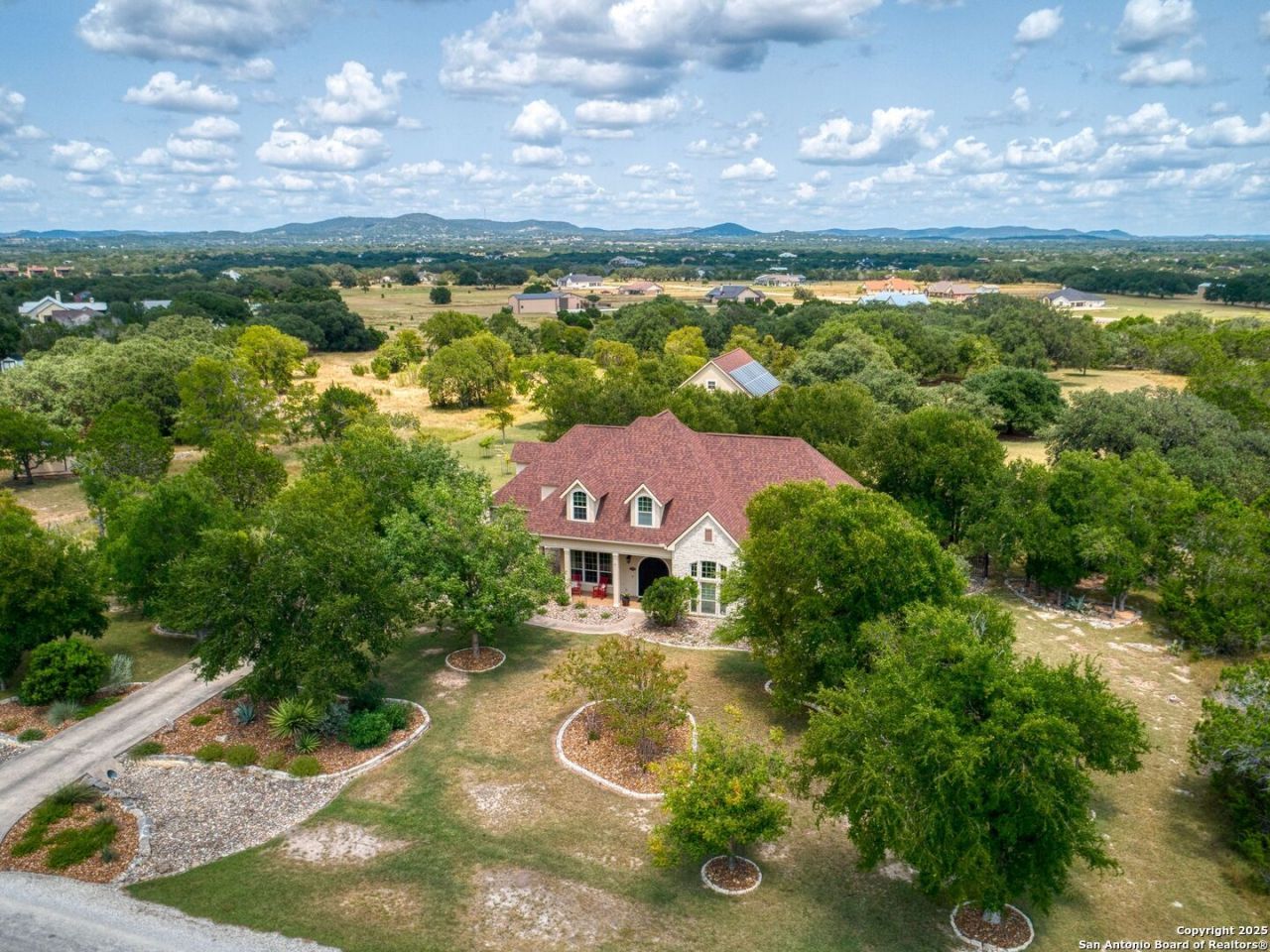 Set on a scenic homesite with sweeping sunset views, this spectacular two-story home with rustic warmth and gorgeous upgrades is tucked in Bridlegate gated subdivision in Bandera, Texas- "The Cowboy Capital of the World." The property includes a huge 30 x 40 RV Barn, spectacular outdoor lighting, water catchment tank, solar screens, covered patio, pergola, green house/garden and awesome outdoor kitchen! Inside you will find an entertainers kitchen with gas cooktop, double ovens, pot filler, tile backsplash, roomy island, built-in wine rack, and custom cabinets. Stereo system inside and out! Relax and enjoy your morning coffee in a sun room designed for easy living. The primary bedroom is private and downstairs, with two additional bedrooms upstairs plus a game room/flex room. Neighborhood amenities include Medina River Park, parks/playgrounds, pools, tennis and club houses. Photos are included above. Steeped in heart, heritage and natural beauty, this Bandera retreat is more than a place to live- Its a place to belong.