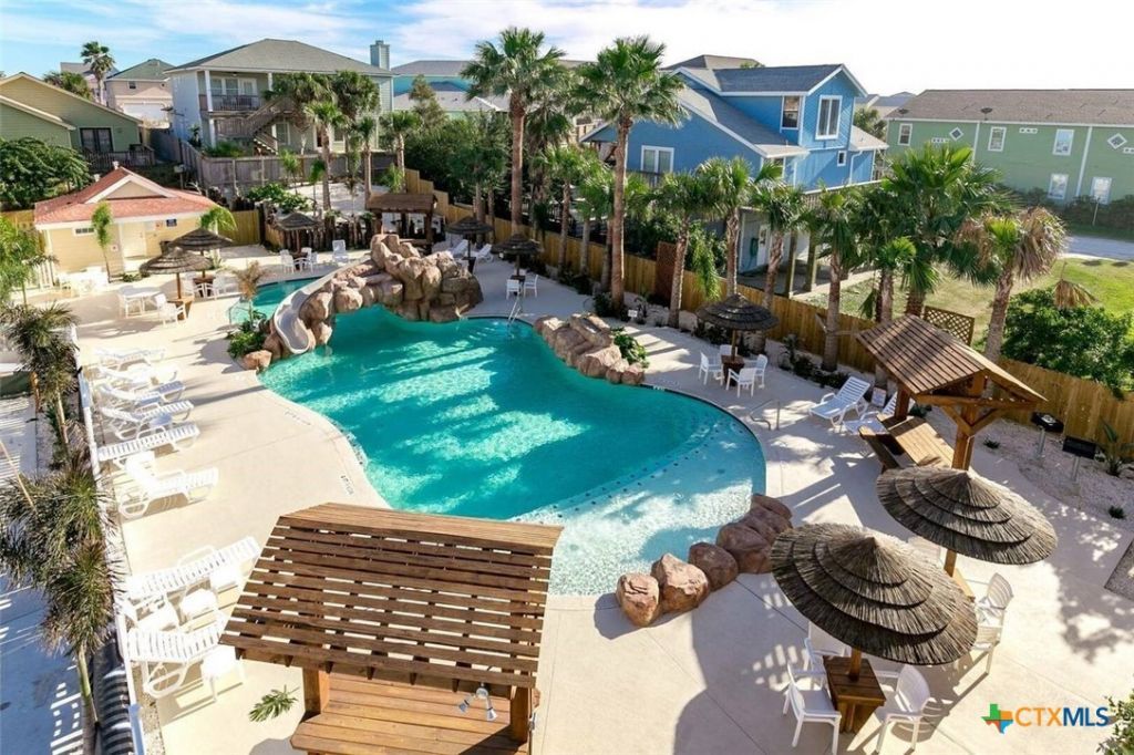 Awesome resort style pool area and steps away from the sand is unit 106 known as the Twisted Pelican . The pool is heated in the winter months, has a slide, palapas and a shared charcoal grilling area. This 3 BR/3BH Beachside Townhome, with stylist furnishing & coastal decor, has a Split-level floor plan which creates privacy among guests and is offered fully furnished. The kitchen has stainless appliances and a large island with seating for 4. Large Tv with cable & Wi-fi plus the game room is complete with an arcade game & air hockey table. The game rm has the flexibility to be used as more sleeping space along with downstairs sleeper sofa. Full sized washer and dryer are stacked in upstairs closet. Primary BR has access to the balcony with table and seating & has an ensuite bathroom for privacy. A garage & two parking spaces and private patio area is a plus! Floor plans in pictures. Enjoy privately, use it as an income-generating rental or a combination of both. Ask for income reports. Quick golf cart ride to restaurants & shopping. Port A is a great destination with 18 miles of golden beaches, warm Gulf waters and endless ways to relax or play. SF per Nueces County Appraisal District, Room sizes from floor plans in pictures. Beachside HOA.