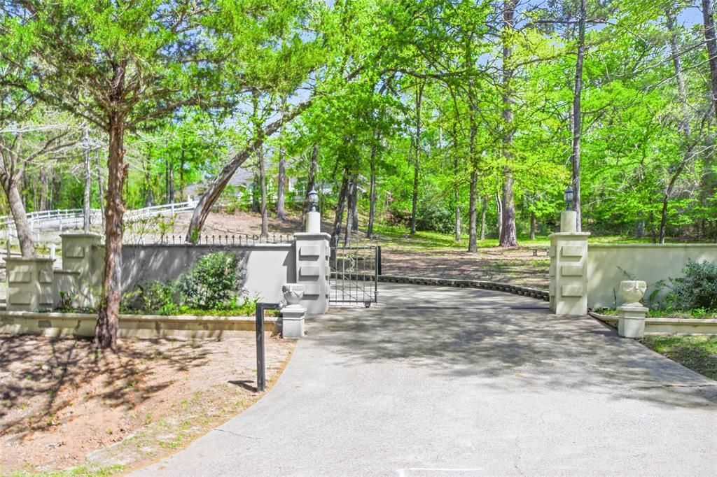 Arrive through a private gated entrance flanked by stucco columns and mature hardwoods to discover this stunning custom Mediterranean-style home nestled on 2.07 wooded acres in Tyler. A sweeping concrete drive leads to the impressive columned facade with arched windows and professional landscaping. Inside, soaring ceilings and an abundance of natural light greet you through an elegant entry door with leaded glass insets and a dramatic arched transom. The spacious great room boasts a curved tray ceiling, wood-burning fireplace with ornate white mantle, and built-in shelving — perfect for relaxing or entertaining. The well-appointed kitchen offers white cabinetry with rope detail, dark granite countertops, center island, tile backsplash, and stainless steel French door refrigerator. The luxurious primary suite includes a spa-like bath with a large walk-in shower with dual shower heads, soaking tub surrounded by mirrors, dual vanities with gold fixtures, and an oversized walk-in closet with abundant natural light. The spacious utility room features cabinetry, tile counters, and washer and dryer connections. Outside, enjoy East Texas living at its finest on the full-length covered back porch with columned veranda, lush lawn, established garden beds, raised vegetable planters, and a separate detached garage and workshop. White board fencing adds classic charm throughout the grounds. Located minutes from Tyler's Loop 49, South Broadway shopping, Brookshire Grocery, UT Health Tyler, and top-rated Whitehouse ISD schools. Easy access to US-69.