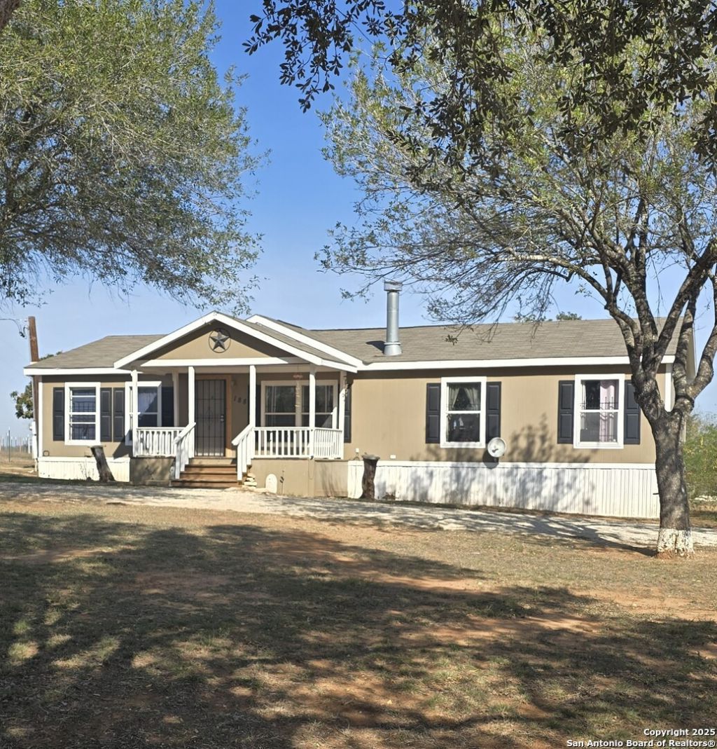 COUNTRY HOME SEEKERS-This immaculate 2006 Clayton manufactured home is situated on 2.075 acres in the fast growing Floresville, TX. Nestled at the end of a culde-de-sac, this property offers a spacious 1474 sq ft layout featuring 4 bedrooms and 2 bathrooms. The inviting living room includes a cozy electric fireplace, and the kitchen boasts an island with ample cabinet space for storage. Step outside to discover country living at its finest. There is a singled carport that leads to a office/study/workshop equipped with water and electricity. The property also includes to additional storage sheds measuring 6x14 and 8x11, plus and another open air structure.
