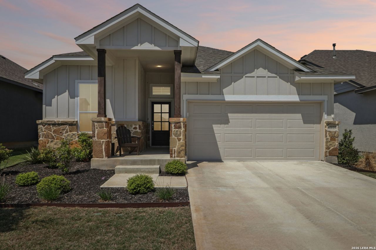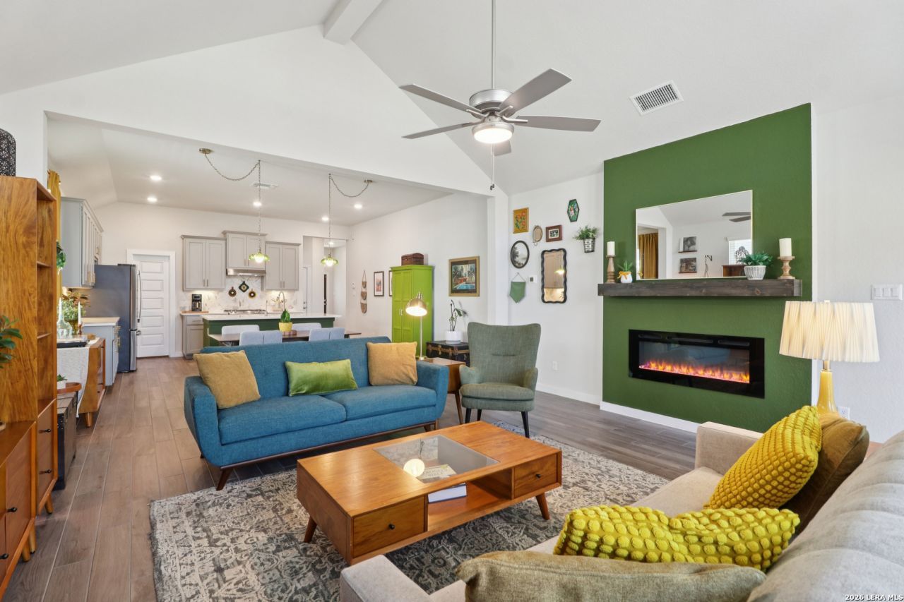 *GOOD FRIDAY OPEN HOUSE, 4/3 from 1-3PM* Welcome to 1935 Scarecrow in the desirable August Fields community of New Braunfels - where thoughtful design, quality construction by Chesmar Homes, and curated upgrades create a home that truly stands out. This beautifully maintained 3-bedroom, 2-bath home with a versatile flex space offers the perfect balance of style and functionality, showcasing subtle mid-century modern vibes and a true pride-of-ownership feel throughout. The moment you step inside, youre greeted by soaring ceilings in the living room, abundant natural light, and a bright, open feel that immediately sets the tone. The living space centers around a cozy electric fireplace, creating the perfect atmosphere for slow mornings with coffee or relaxing evenings at home while adding warmth and charm to the heart of the home. The kitchen delivers a true WOW factor featuring a gas range with upgraded vent hood, plus a smartly designed ventilated pantry - perfect for keeping appliances like an air fryer, coffee makers, and other countertop essentials tucked away while keeping your kitchen feeling clean and organized. Its these intentional upgrades that make this home feel a step above many new construction options. Natural light pours into the home thanks to large, thoughtfully placed windows, a feature not always found in newer builds. The extra flex room, currently used as a sewing room, is especially bright and inspiring, making it an ideal space for a home office, creative studio, playroom, or second living area. One of the most unique spaces in the home is the secondary bedroom designed with rich English study inspiration and moody designer touches, creating an unforgettable space full of character. Whether used as a bedroom, office, or reading retreat, it offers a dramatic and elevated feel you rarely find in homes at this price point. The primary suite is a true retreat, featuring a spa-inspired bathroom with a large walk-in shower showcasing custom mid-century inspired tile work, a fully tiled shower floor instead of a standard shower pan, and beautiful designer finishes. The spacious primary closet continues the elevated feel with custom details that make the space both beautiful and functional. This bathroom truly delivers the kind of WOW factor buyers are looking for. Step outside and youll find a backyard intentionally designed for comfort, privacy, and maximum enjoyment of the space. The pergola creates the perfect sitting area for entertaining or unwinding, while the privacy slat wall, updated fencing, iron accents, crushed granite, and established landscaping all come together to create a peaceful and polished outdoor retreat that truly feels like an extension of the home. Beyond the home itself, the location is another standout feature. August Fields offers a convenient New Braunfels lifestyle with quick access to shopping, restaurants, grocery stores, and daily conveniences, making errands easy while still enjoyin