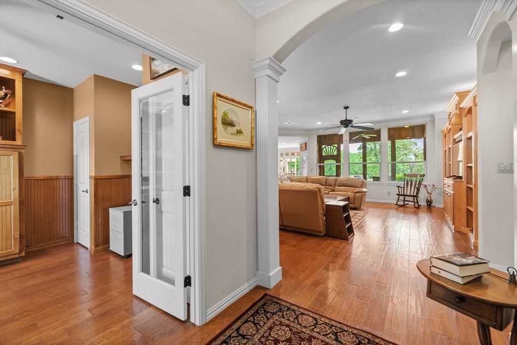 Welcome to lake living in The Shores on Richland Chambers Lake, where Hill Country charm meets comfort and functionality. Situated on a .523-acre canal-front lot with water views, this 5-bedroom, 3.5-bath home offers over 3,000 sq ft of inviting, open-concept living designed for relaxing weekends and effortless entertaining.Inside, you’ll find warm wood flooring, arched walkways, crown molding, and a light-filled living area with custom built-ins and backyard views. The kitchen is designed for gathering with granite countertops, a large island, walk-in pantry, breakfast bar, and a beverage station with wine fridge. A private office with French doors and multiple dining areas add flexibility.The spacious primary suite features a soaking tub, separate walk-in shower with body sprays, dual vanities, and generous storage. Additional bedrooms include a Jack-and-Jill layout, ideal for family or guests.Outdoors, enjoy peaceful mornings, sunset evenings, and easy access to the water with a covered patio, fire pit, and mosquito misting system. The property includes a private boathouse with lift, plus Boat Slip #19 in The Shores marina—giving you the best of both worlds with private dock access and quick entry to open water.A detached structure adds versatility with a 625 sq ft workshop below and a 450 sq ft efficiency guest apartment above, complete with kitchenette—perfect for guests, extended stays, or potential income.Additional features include a whole-home water filtration system and tankless water heater. Located in a gated community with marina, pool, clubhouse, fitness center, and more—this property is your gateway to enjoying the best of Richland Chambers Lake.