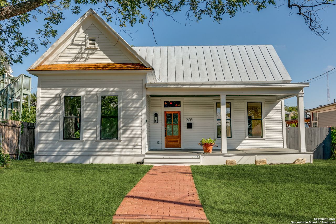 205 E. Rische pairs historic character with urban farmhouse design in the heart of Southtown. Set within the Nathan Historic District, the home offers the exterior architectural charm King William area buyers admire. Inside, the home was taken down to the studs and completely updated for modern living. Soaring ceilings, six-foot windows, herringbone hardwood floors, exposed beams, and a custom stained-glass transom honoring its 1930 Folk Victorian roots. The kitchen centers the home with an oversized island, luxury-level appliances, Calcutta Idlillo quartz, and warm brass finishes. Three bedrooms, two-and-a-half refined baths, a covered rear porch and gated parking complete the package. From your home, enjoy views of the iconic Pioneer Flour Mills and Tower of the Americas. Just minutes from Blue Star, King William, and the River Walk-walkable, connected, and positioned for long-term value. Schedule your showing today.