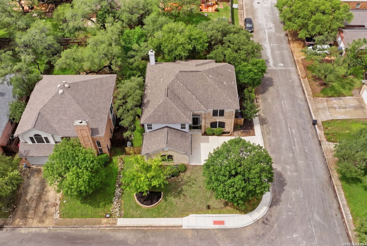 Spacious two-story home on a corner lot in desirable Encino Forest in North Central San Antonio, offering flexible living, extensive upgrades, and strong location benefits. The main level includes a dedicated office with French doors, formal and casual living spaces, a large dining area with custom dry bar and built in shelving, and a family room with fireplace and prewired media setup. The kitchen includes an island, updated soft close drawers, Rev A Shelf pullout, abundant cabinetry, and adjacent breakfast area. A sunroom adds valuable enclosed flex space and offers options for a second sitting area, reading room, hobby space, workout area, or additional living space, while improving connection to the backyard and outdoor living areas. The generous primary suite includes a large arched window, updated air return for improved comfort, and spacious bath layout. Upstairs includes secondary bedrooms, updated Mohawk laminate flooring. The fourth bedroom includes a bonus space that can be used for a craft area, sitting room, or flex space. Extensive interior improvements include recessed LED lighting, updated switches, upgraded outlets, ceiling fans, new door hardware, crown molding, chair rail detailing, and updated guest bath tile flooring. Major system improvements include upgraded attic insulation to R 38, HVAC enhancements including duct improvements, custom plenum, UV light, condenser hard start kit, drain float switch, and duct cleaning. Plumbing improvements include pressure reducing valve, expansion tank, and repaired kitchen sewer drain beneath foundation with the remainder of a transferable one-year warranty. Google Fiber available. Water softener system rebuilt. Outdoor features include a 15 x 13 concrete patio, mature trees, fenced backyard, and usable yard space. Exterior improvements include James Hardie Cedarmill siding, Simonton 5500 dual pane Low E windows, updated trim, and exterior paint improvements. Convenient access to Highway 281 and Loop 1604 supports efficient commuting to major employment centers, shopping, dining, medical services, and everyday conveniences. Nearby amenities include H E B, Stone Oak retail and restaurant destinations, and Methodist Stone Oak Hospital. Regional access to Joint Base San Antonio locations adds broader connectivity. Includes 3D walkthrough and floor plan.