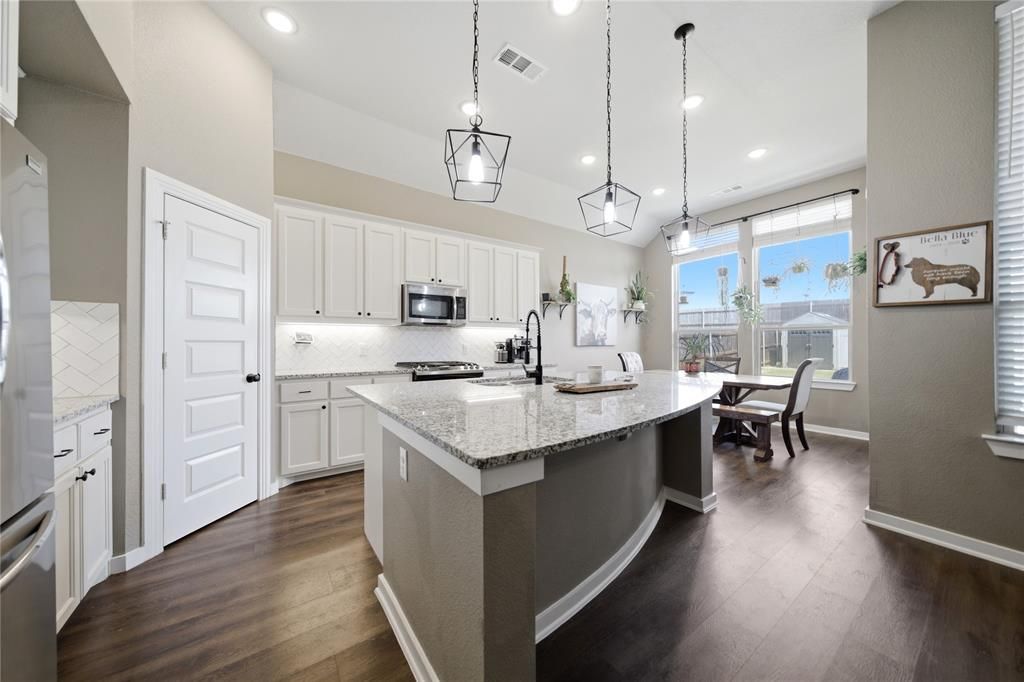 Come Live the Dream in the sought-after Waterscape Community! This stunning, one-story home, built by Highland, has 4 bedrooms, 3 full bathrooms + flex room for office, dining room, or playroom. The spacious open floor plan, 12-foot ceilings and amazing kitchen makes a perfect set up for entertaining friends and for large family gatherings. The master suite, with its bay window offers plenty of space for your own private reading area, and includes a great ensuite bath with dual sinks, a soaker tub and a separate shower. The kitchen features an enormous island, SS appliances, a great walk-in pantry and tons of cabinets, with under cabinet lighting. Tall windows throughout the home flood the space with natural light. Living room has a beautiful stone fireplace for cozying up on cool nights and sipping some hot chocolate. Other notable features include a tankless hot water heater, decorative lighting and plenty of closets throughout for all of your storage solutions. Outdoors you will find an oversized covered patio and a large backyard for grilling and watching the children play. Paula Walker elementary school is located in the neighborhood. Interior completely repainted 2023. Flooring, baseboards, dishwasher and driveway replaced 2023. You will Fall in Love with this Like New Home!! Community Amenities include several ponds for catch and release fishing, 2 pools, dog parks, many pocket playgrounds, Basketball court, walking paths, sand volleyball court and more.