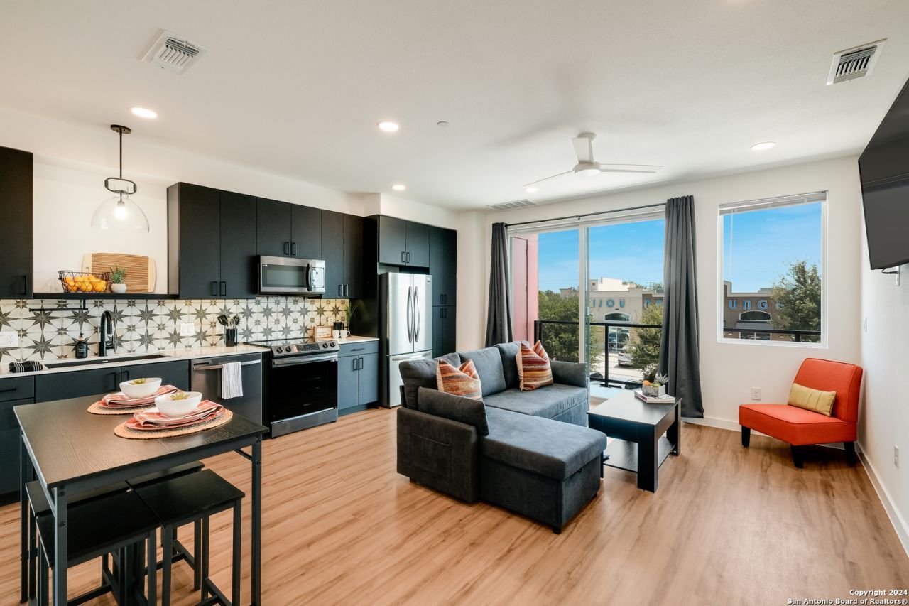 Come enjoy this luxurious condominium located in Freiheit Village! Minutes from downtown New Braunfels and historic Gruene, the gated Mercer community is walking distance from countless options of shopping and dining, and located in one of Texas highly desirable destinations! The open floor plan boasts lots of natural light through expansive windows, 10 ceilings, 7" luxury vinyl planks, water softener, WIFI smart home with ring doorbell, covered patio with storage room, spacious living area and separate laundry space with full size washer and dryer. Private primary suite includes generous closet and an oversized bathroom with frameless walk-in shower. Chefs kitchen is equipped with modern Samsung appliances, deep kitchen sink, quartz counters, smooth cooktop and abundance of cabinetry. Dont miss out on the amazing community amenities: resort-style pool, dog park with washing area, yard games, and an entertainment area with outdoor kitchen, bar and grill.