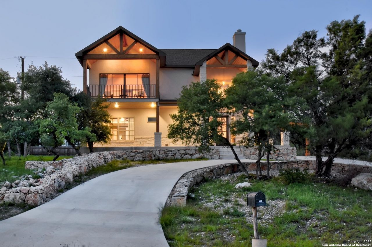 LUXURY LIVE AUCTION! Bidding to start from $380,000.00! Step into the charm and calm of Hill Country living-just minutes from the sparkling waters of Canyon Lake. This thoughtfully designed custom home welcomes you with a wide wrap-around porch, a generous upstairs balcony, and stunning views. Inside, the kitchen is a true gathering space, filled with beautiful finishes and open to a living area that features vaulted ceilings and a cozy wood-burning fireplace-perfect for slow mornings and long conversations. Youll find not one, but two primary suites-one upstairs and one down-offering flexibility for guests or multi-generational living. The upstairs bathroom feels like a private spa retreat, complete with a deep soaking tub and elegant floor-to-ceiling tilework. A spacious loft adds even more versatility-it could easily be a third bedroom, home office, or creative studio. With laundry hookups on both levels and every detail crafted with care, this home is as functional as it is beautiful. Whether youre looking for a peaceful place to call home, a weekend getaway, or a cozy vacation rental, this Hill Country gem is ready to welcome you in every season.