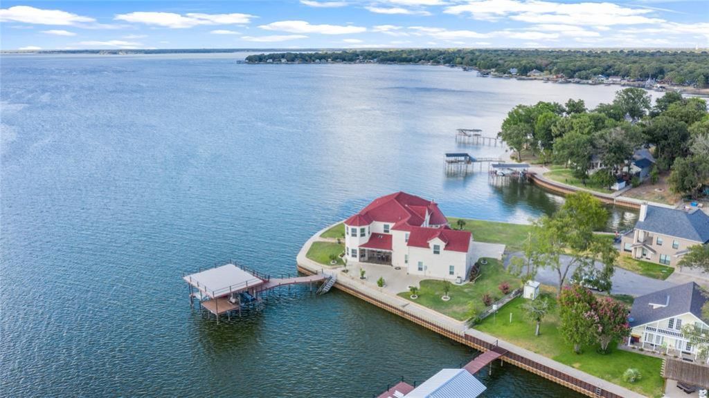 Imagine owning a breathtaking waterfront property on an open water peninsula with 363 feet of shoreline— This incredible 4-bedroom home (plus office, which could also serve as a formal dining room or 5th bedroom) offers a lifestyle of luxury and relaxation, directly on the water at Cedar Creek Lake. Designed to take full advantage of the expansive views, the home features almost every room with stunning water vistas. You'll love the spacious, open floor plan with real wood floors, soaring 12-foot ceilings, and large windows that invite natural light and panoramic views throughout. The kitchen includes a large island with seating, granite countertops, and a wine refrigerator, perfect for entertaining or enjoying family meals. The main floor water side master suite offers a serene retreat with a gorgeous bathroom featuring double vanities, a separate tub, a walk-in shower with multiple heads, and a custom walk-in closet. Additional highlights include a bonus room for a second living area or game room, a media room or bunk room, and an oversized 3-car garage. Step outside to enjoy the screened porch with an outdoor kitchen with sink and oven or relax on the composite decked boathouse, which includes a party deck and covered sitting area, perfect for lakeside entertaining. Onduvilla roof, a waterproof clay tile look roof designed and guaranteed to withstand winds up to 150 miles per hour per the manufacturer. in Gun Barrel City on Cedar Creek Lake, this home is just an hour from downtown Dallas, yet a world away from the hustle and bustle. With all the furniture, boat, and personal watercraft included, this home is truly a turnkey waterfront retreat!