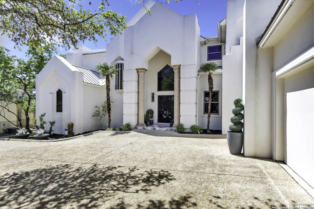Experience unparalleled contemporary living in this architecturally stunning residence, designed to capture breathtaking Hill Country sunset views. From the newly painted stucco exterior, dramatic parapet peaks soar towards an incredible crows nest lookout, all crowned by a sleek, commercial-grade silver metal roof. Step through impressive double prism doors, framed by grand two-story Cantera stone pillars, and be immediately greeted by stunning vistas. The heart of the home is the awe-inspiring 2.5-s