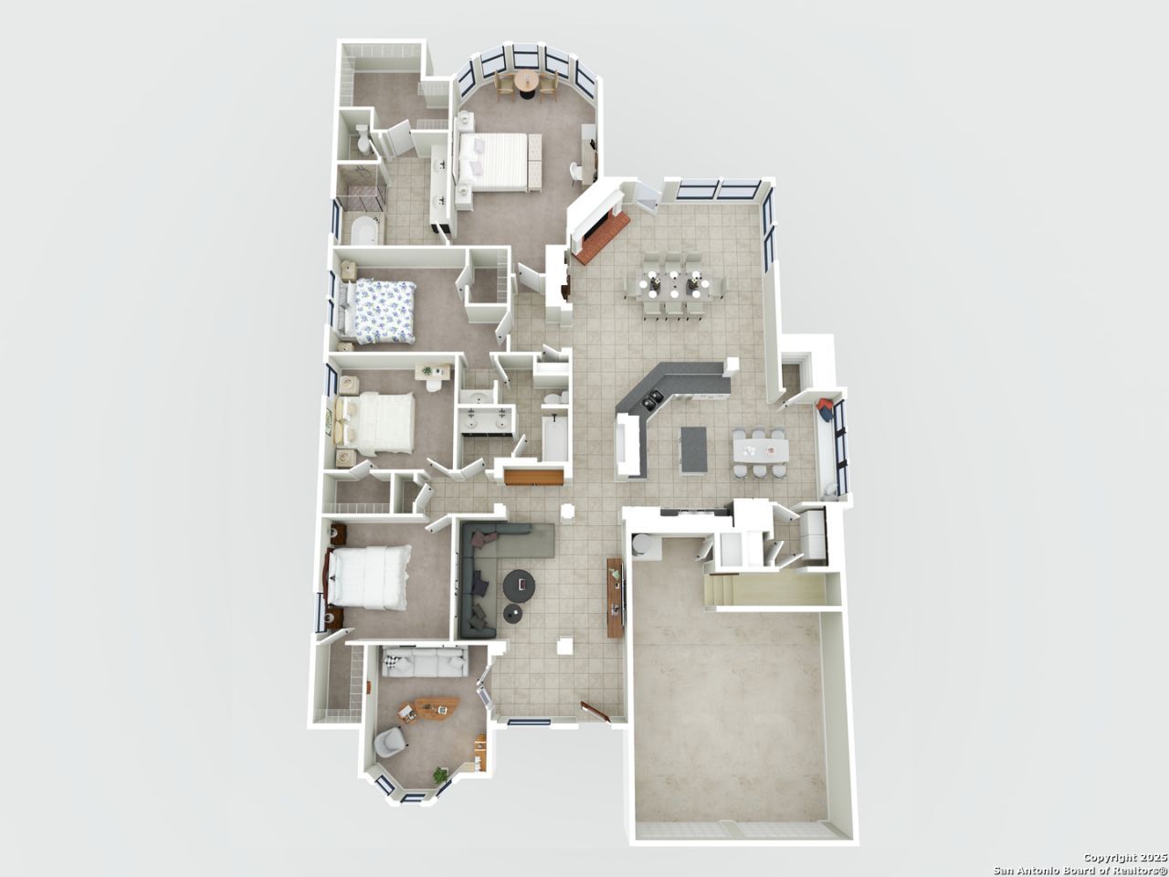 Set within the charming, gated community of Belterra, this single-story gem sits proudly on a corner lot, radiating curb appeal with its all-brick exterior and inviting covered porch. From the moment you approach, you will notice the tall, richly stained wood door with an ornate glass feature that sets the tone for what awaits inside. The foyer makes an impression with its spacious feel, high ceilings, and 18x18 tile that gives the space a clean and polished look. To your right, a private office with French doors and large bay windows creates the perfect work-from-home haven or a quiet space to focus. Across the hall, a dedicated dining area makes hosting family dinners or holiday gatherings effortless, positioned perfectly next to the kitchen. The kitchen is where this home truly shines. Designed for both everyday function and entertaining, it boasts granite countertops, stainless steel appliances including a refrigerator, and a 5-burner gas cooktop. The center island provides extra storage and electrical outlets for meal prep or baking days, while bar seating and a built-in breakfast nook with bench seating make casual meals a breeze. A generous walk-in pantry keeps everything organized and close at hand. The open-concept living room is the heart of the home, anchored by a gas-burning fireplace that invites you to settle in on cooler evenings. Large windows flood the room with natural light and provide a view of the backyard, while direct access to the covered patio makes indoor-outdoor living seamless. The oversized primary suite feels like its own retreat. With soft carpeting underfoot, bay windows that bring in morning light, and a ceiling fan for comfort, this room is made for unwinding. The en suite bathroom is spacious and well appointed, featuring dual vanities with an oversized mirror, a jetted soaking tub for end-of-day relaxation, a separate tiled shower, and a walk-in closet large enough to keep everything organized. The three additional guest bedrooms each come with walk-in closets, ceiling fans, and large windows, offering plenty of space for family or visitors. They share a thoughtfully designed Jack and Jill bathroom with dual and single vanities, plenty of storage, and a tub-shower combo with tile surround. Practical touches like the utility room with full-size washer and dryer connections, cabinetry, and an extra storage closet make everyday chores easier. Step outside to the covered back patio with embellished tile and pull-down shades, perfect for quiet coffee mornings or weekend barbecues. The level, fenced-in yard offers privacy and space to play, and the two-car attached garage adds convenience. Living here means access to controlled neighborhood gates, a community pool, a barbecue area, and a playground. All of this within the highly rated Comal ISD, making it a wonderful place to call home.