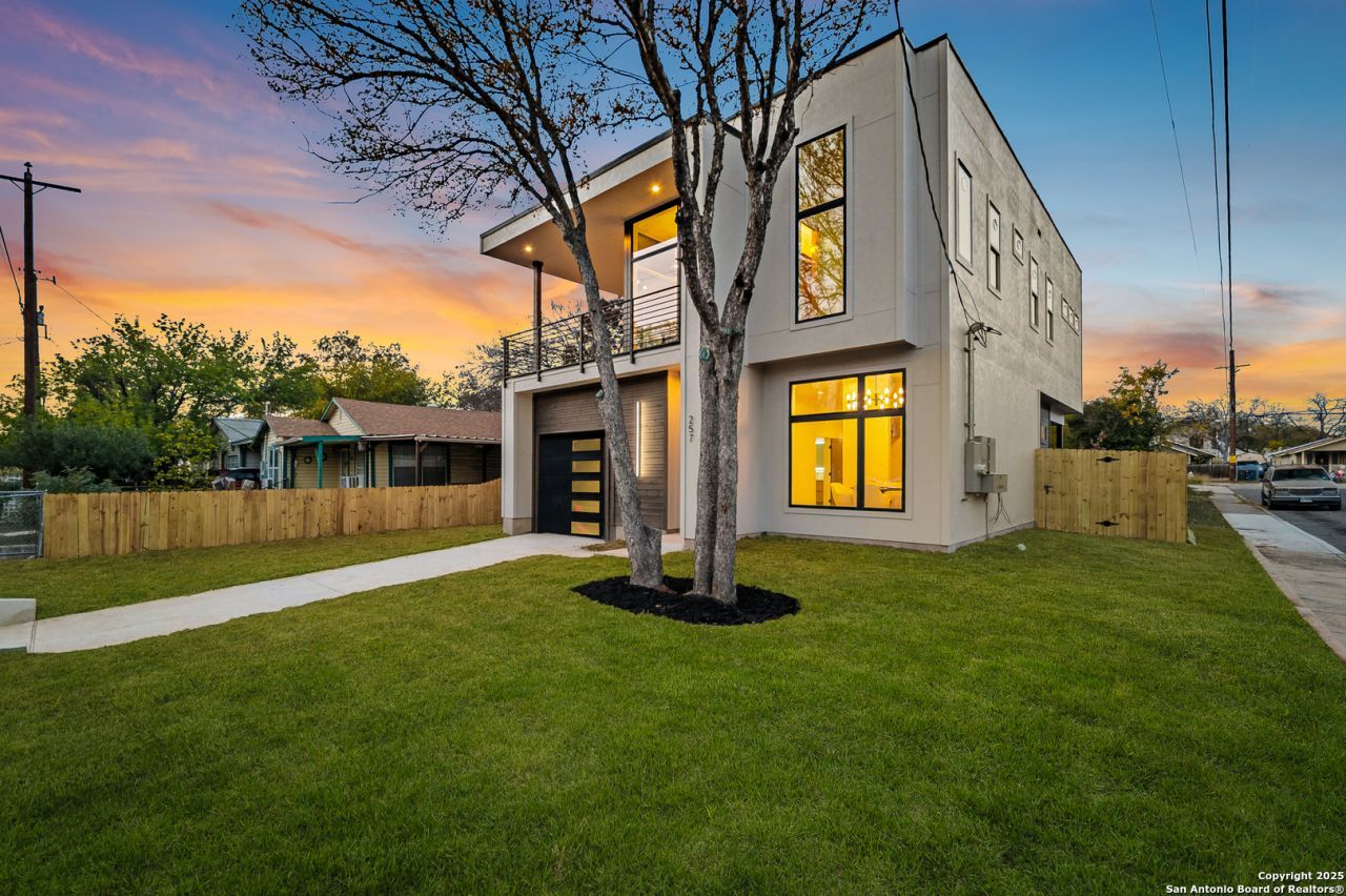 ***OPEN HOUSE SAT FEB 20TH FROM 2-6pm*** Experience modern minimalist luxury in this brand-new Japandi-inspired home just minutes from Downtown San Antonio. Situated in the vibrant Southtown/Lone Star Arts District, this contemporary new construction blends clean architectural lines with warm natural finishes and thoughtful design throughout. The open-concept layout is filled with natural light from floor-to-ceiling windows and features high ceilings and luxury vinyl flooring. The chefs kitchen showcases quartz countertops, European-style floating cabinetry, and sleek modern finishes, opening seamlessly to the main living area-perfect for entertaining. The primary suite is a private retreat with a spa-style bathroom featuring a soaking tub, rainfall walk-in shower, and a custom walk-in closet. A secondary living area with a built-in wet bar and wine fridge adds flexibility for entertaining, work-from-home, or relaxing. Outdoor living is a standout, with covered patio spaces and elevated views that capture the Tower of the Americas and downtown skyline. The spacious yard offers room for a future pool, garden, or casita. This home is equipped with modern conveniences, including a tankless water heater, smart garage with EV-ready outlet, and a high-security VDom Deux modern front door. Move-in ready and thoughtfully designed, this is a rare opportunity to own a luxury new construction home near downtown dining, culture, and entertainment.