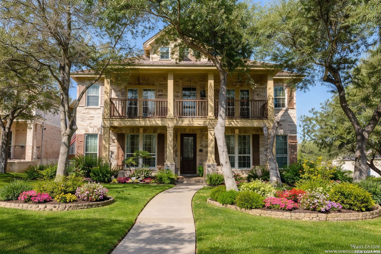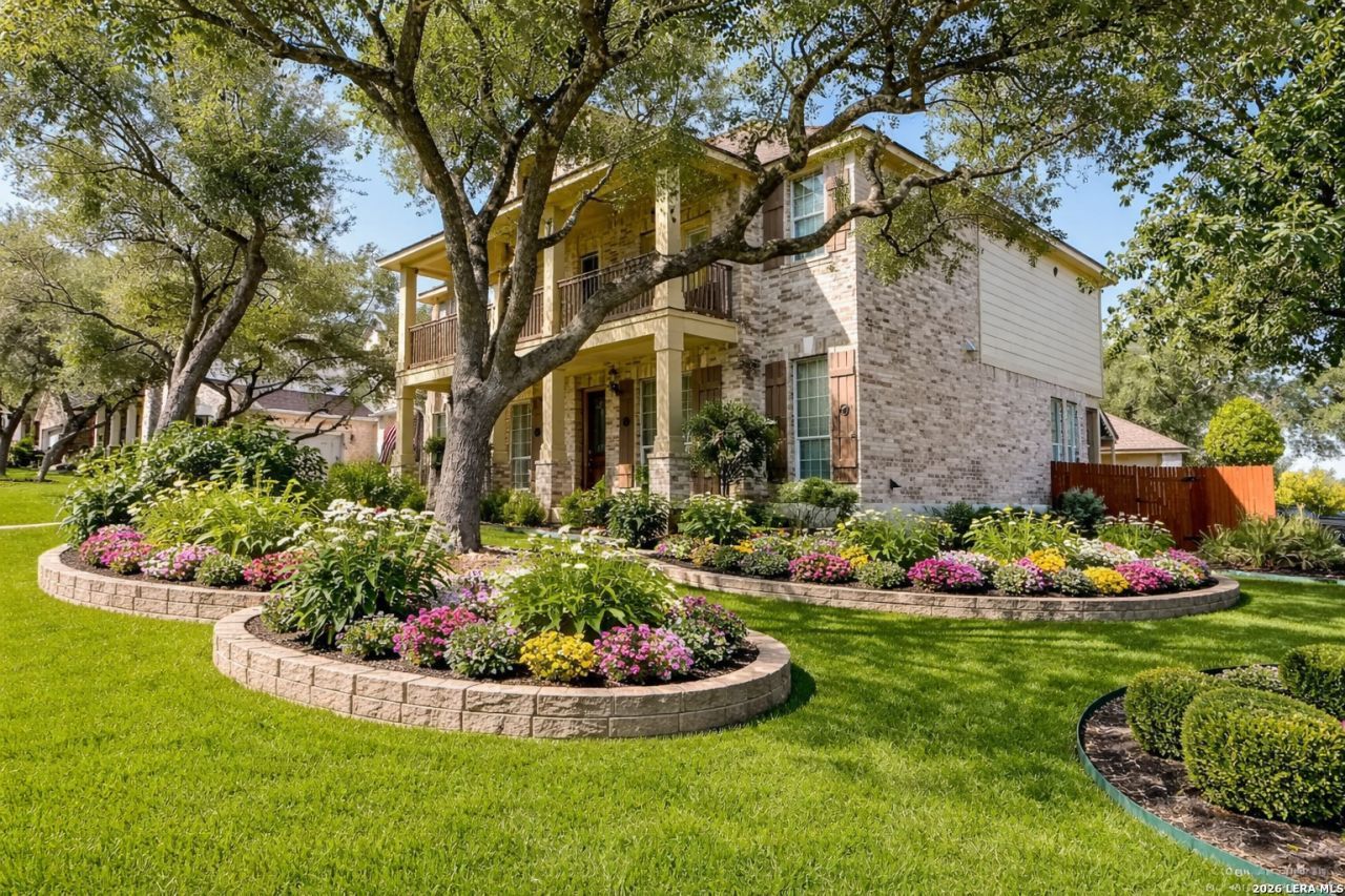 Beautiful Two Story Home in Prestigious Gated Community. Nestled on a tree -covered corner lot, this stunning traditional home offers style, comfort, and convenience. Featuring 4 bedrooms and 3.5 baths, this home showcases an open floor plan with soaring two story ceilings and abundant natural light. The updated kitchen includes gray cabinetry, quartz countertops, and built-in stainless steel appliances-- perfect for everyday living or entertaining. The primary suite is located downstairs and features a spa like bath with a garden tub and separate shower. Upstairs, enjoy a spacious media room ideal for movie nights or play area. No carpet in the main living areas or bedrooms. Step outside to a large balcony and take in the views of the beautiful tree-shaded surroundings. Located in Comal ISD with award winning schools, no city taxes and quick access to Highway 281 and is just minutes from outstanding shopping, dining and entertainment.