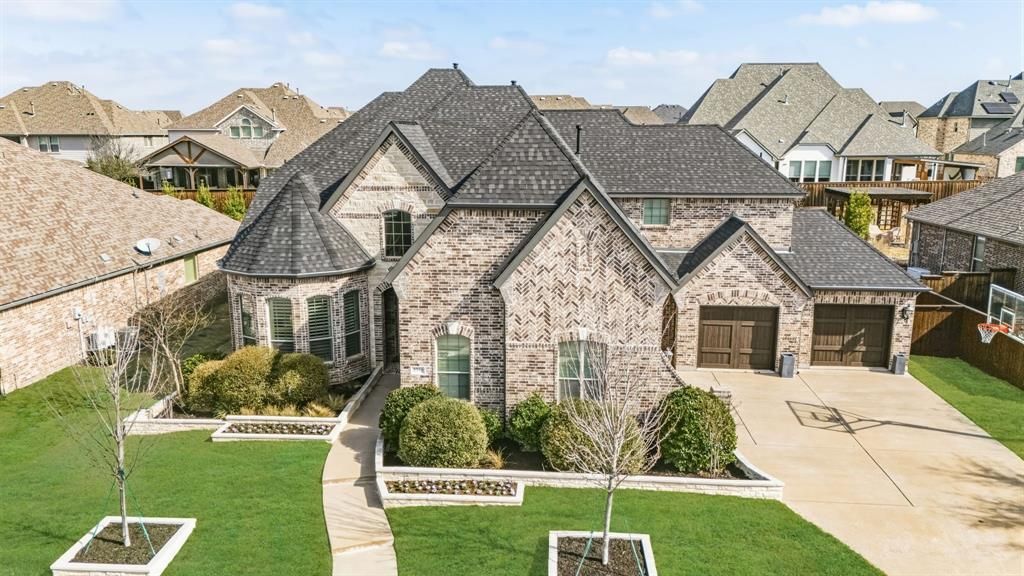 Indulge in resort-style living in the master planned community of Mustang Lakes, where this stunning home features sophistication & comfort. Thoughtful details include soaring ceilings, elegant wood floors & designer Restoration Hardware light fixtures throughout. Every BR offers its own full bath & walk-in closets. The spacious office is ideal for working from home. The dining room, adorned with a beamed ceiling, provides ample space for hosting gatherings. The gourmet kitchen is a chef’s delight featuring a large island, granite counters, gas cooktop, & abundant storage, plus a walk-in pantry, pull out spice drawers, with room to store appliances. Family room opens to kitchen & breakfast room & is centered by a cozy fireplace & floor to ceiling windows. The primary suite is a private retreat with separate vanities, garden tub, oversized shower, & large walk-in closet. Upstairs, a game room & media room with built in cabinets & fridge offer plenty of entertainment space. Find 2 additional BRs with full baths upstairs & walk out attic space. Enjoy outdoor living at its finest with a backyard oasis. The custom patio features dual seating areas, see-through fireplace, built-in outdoor kitchen with grill, smoker, & refrigerator plus bar seating. The custom hurricane-rated electric patio shades ensure comfort in any weather, allowing screens to stay down even in severe weather. The sparkling pool boasts water features, hot tub & built-in basketball goal, providing endless fun & relaxation. The surrounding turf & side yard offer room for play & 4 car garage with epoxy floors provides room for everyone’s vehicle. Includes whole house Generac Generator back up power. Enjoy stellar community amenities: resort-style pools, tennis courts, fitness center, clubhouse, fishing, basketball courts, miles of scenic trails & neighborhood elementary school. This stunning home offers a lifestyle that promises never-ending enjoyment & luxury.