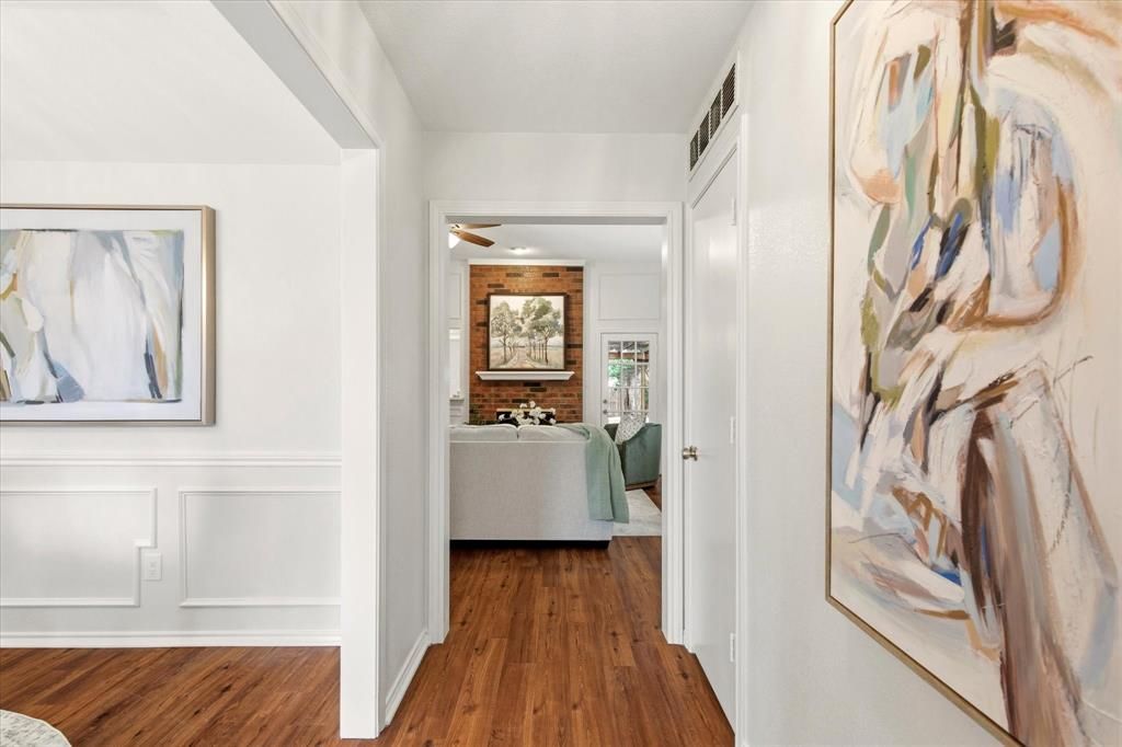 Beautifully renovated single-story home in the highly sought-after Nob Hill neighborhood, offering a rare combination of nature, thoughtful upgrades, and convenient access to everything North Dallas has to offer. Upon entry, you’re welcomed by sweeping wood-look laminate flooring that flows throughout the home, complemented by tile flooring in the kitchen and bathrooms. A formal dining room just off the entry provides an elegant space for gatherings and offers convenient access to the kitchen. The updated kitchen features Quartz countertops, a new Frigidaire stainless oven, 5-burner cooktop, decorative tile backsplash, freshly painted cabinetry, and modern hardware. The light-filled living room is centered around a cozy gas fireplace, ideal for relaxing or entertaining. A versatile bonus room offers endless possibilities and can be used as a game room, second living area, study, playroom or flex space. A stylish wet bar with glass shelving, built-in cabinetry, and Quartz countertops makes entertaining effortless. The tranquil primary suite provides a private retreat and includes a beautifully updated ensuite featuring dual sinks with Quartz countertops, a freestanding deep Japanese soaking tub, a large glass shower with Italian marble tiled walls, contemporary hardware, and two walk-in closets. Two spacious secondary bedrooms also feature walk-in closets and share access to a well-appointed updated full bathroom. Step outside to your private backyard oasis, complete with a stamped concrete covered patio, raised vegetable garden, and mature landscaping with fruit-bearing trees and plants. This home also includes major system upgrades and foundation work with a transferable warranty, providing peace of mind for years to come. Located just steps from the Furneaux Creek Blue Trail greenbelt, the home provides easy access to trails, parks, wildlife, and peaceful outdoor spaces while still being minutes from PGBT, I-35, 75, and the DNT, as well as shopping and dining.