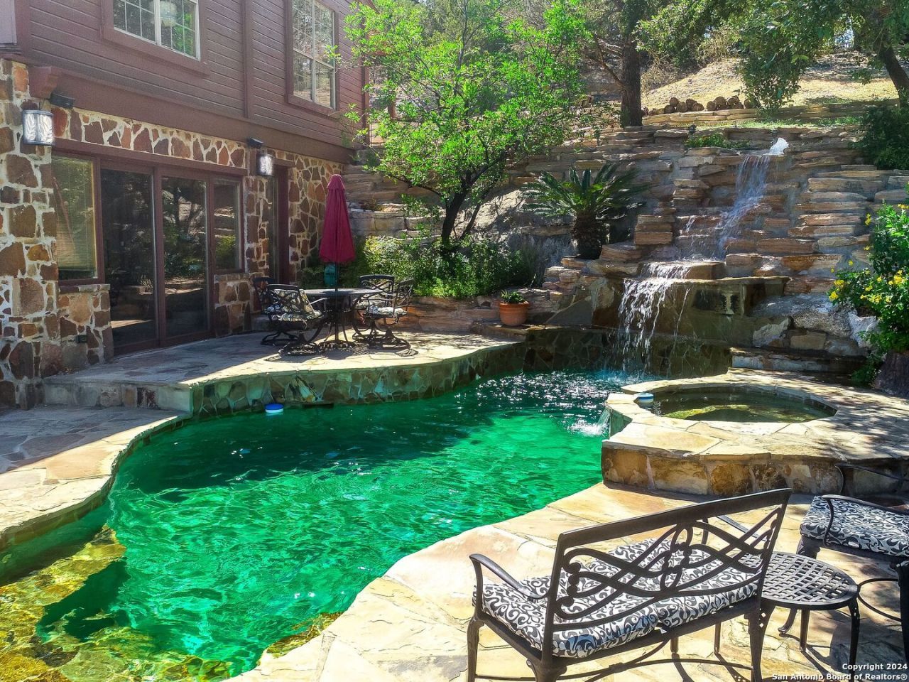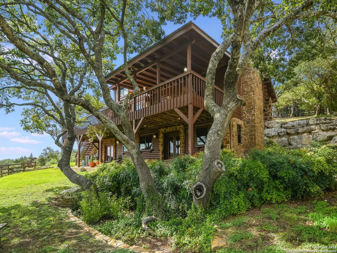 Original Log Home (3,634 sq ft) Cabin (1,500 sq ft) Four Bay garage. Where Civilization Meets Nature. Perched atop the highest point in Bexar County, this remarkable 5-acre estate welcomes you to the Ramblewood Resort, a private hilltop retreat with sweeping Hill Country views and two distinct residences. The grounds offer a true resort-like setting, featuring terraced landscapes, winding rock pathways, and a striking waterfall that flows into a sparkling pool beside a hot tub. A lush, level lawn creates the perfect backdrop for alfresco dining, recreation, and memorable gatherings overlooking the lower acreage. The authentic log home, built in the 1980s from Northeastern white pine, spans more than 3,500 square feet across three levels. It includes three bedrooms, three bathrooms, and two fireplaces, with expansive porches and patios along the main and lower levels that seamlessly connect indoor and outdoor living. A separate countryside cabin provides approximately 1,500 square feet of versatile space over two levels. Complete with a game room, 2 kitchens, 2 full bathrooms, office, and additional lofted sleeping area or reading nook, it offers added privacy with its own dedicated drive. Two covered porches. One taking in the views and the other perfect for enjoying s-mores in the built-in rock firepit. Additional highlights include a four-bay detached garage with 2 open bays perfect for parties with panoramic views.Durable metal roofs on all structures, and expansive lower acreage featuring a pond and open space ideal for sports, picnics, or camping. Located in the Country Place Subdivision, residents enjoy community amenities such as a pool, tennis courts, and scenic bridle paths. Conveniently situated off Hwy 281, youre just 18 minutes from San Antonio International Airport, 24 minutes from The Pearl, and 26 minutes from the Alamo. Driving to Hwy 46, Boerne is a 45-minute drive, and New Braunfels is just 38 minutes away.